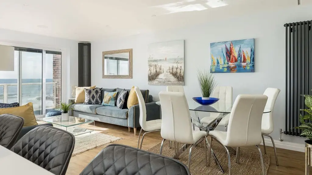 Living Area with two 2-seater sofas and Smart TV. Dining table and chairs to seat six. Patio doors opening onto terrace overlooking the beach