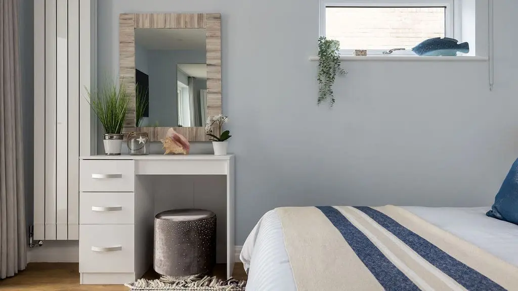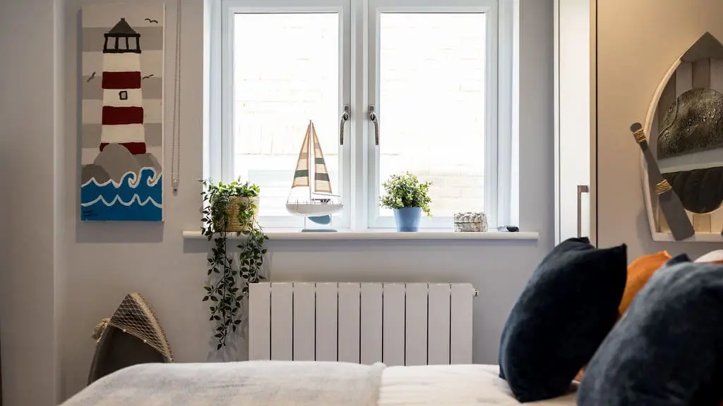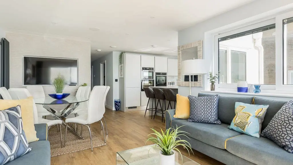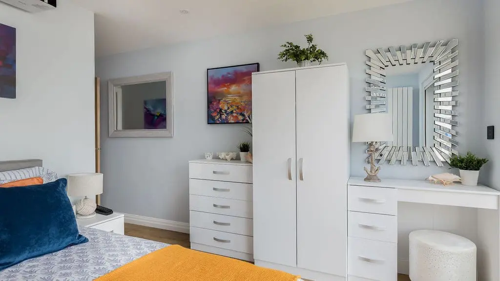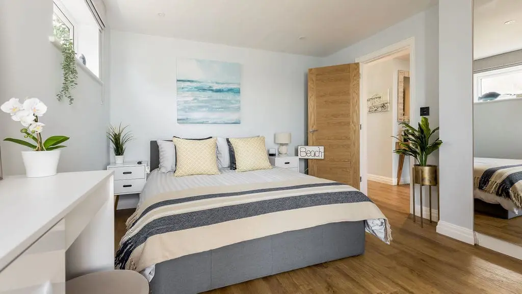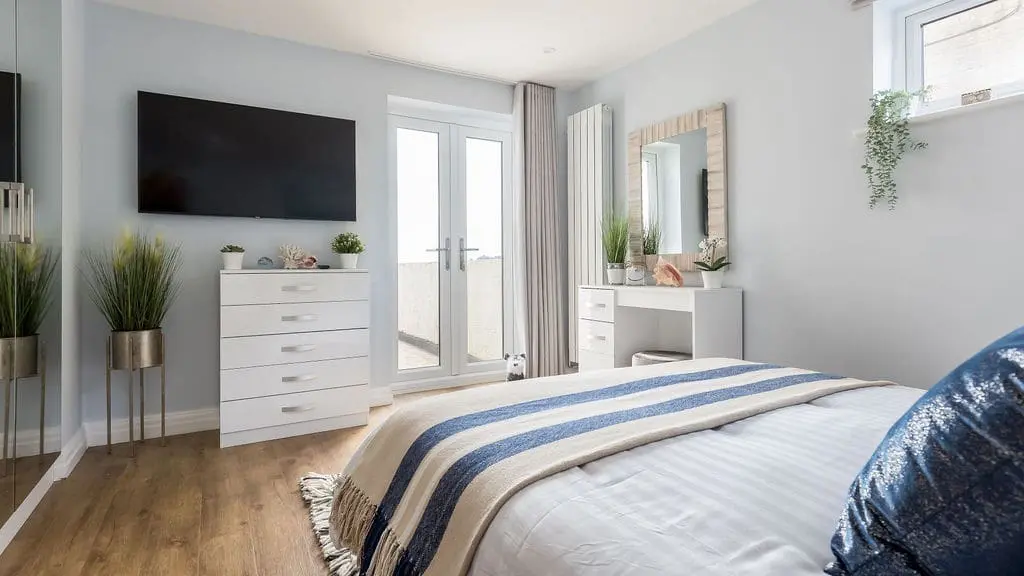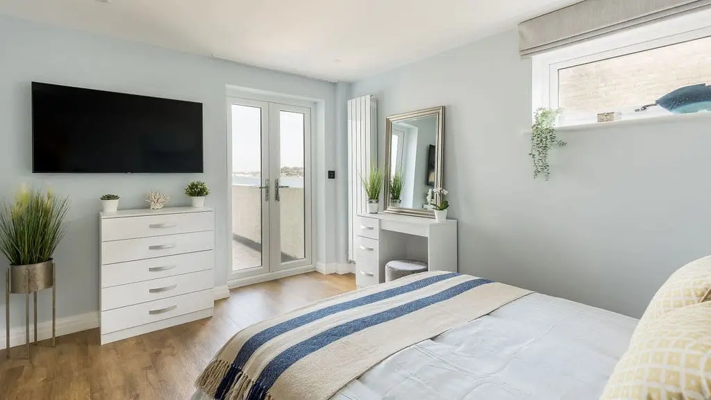 Accommodating up to six guests, the apartment features three luxurious bedrooms. One of these cleverly transforms into a private cinema room, with a patio blind that doubles as a screen. Two of the bedrooms boast spectacular harbour views, complete with patio doors opening onto a balcony—an idyllic spot to unwind with an evening drink while watching the sun set over Poole Harbour.
