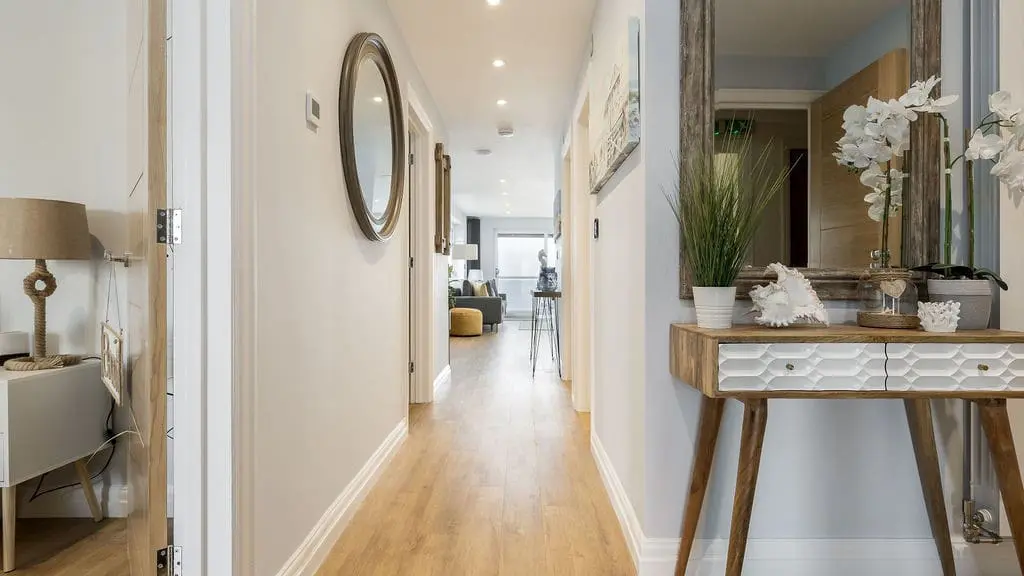 Front door to entrance hallway leading to open plan kitchen and living space