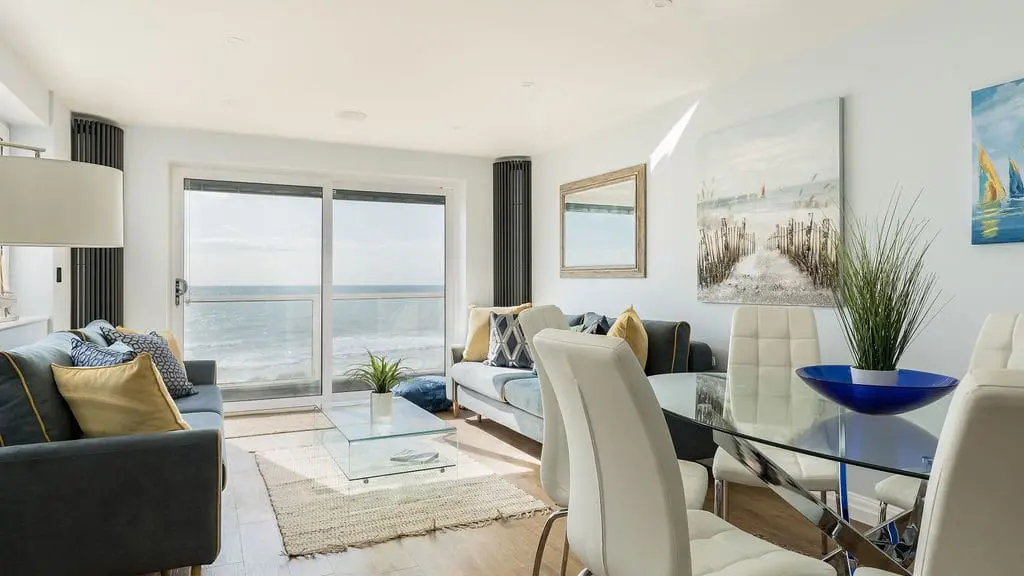 The apartment enjoys direct access to Sandbanks Beach and is just a short stroll from local amenities, including watersports facilities, charming cafés, an Italian bistro, and the renowned Rick Stein’s restaurant.