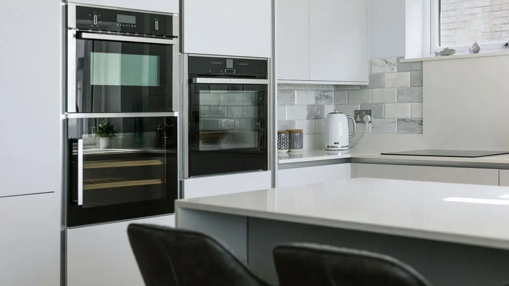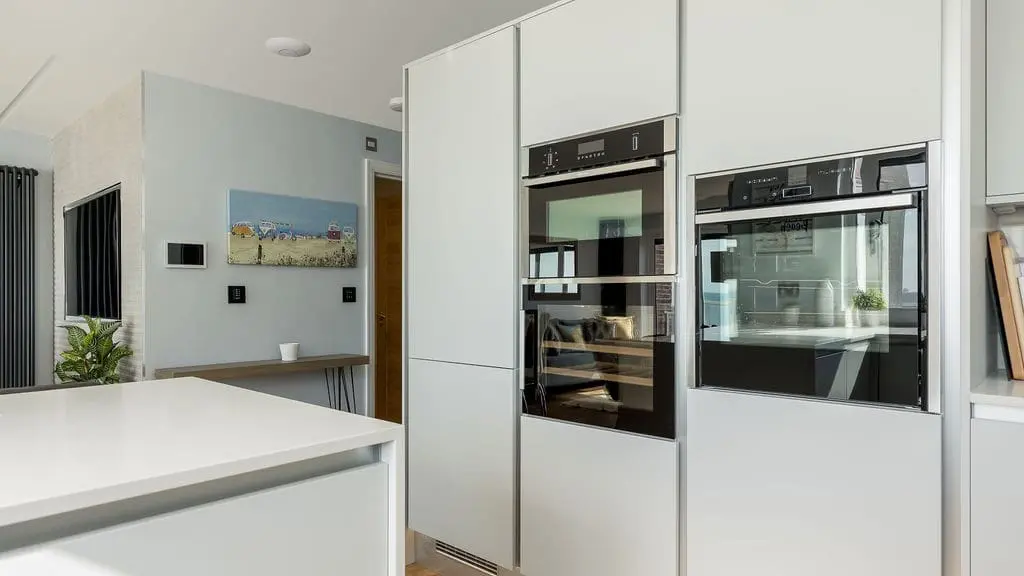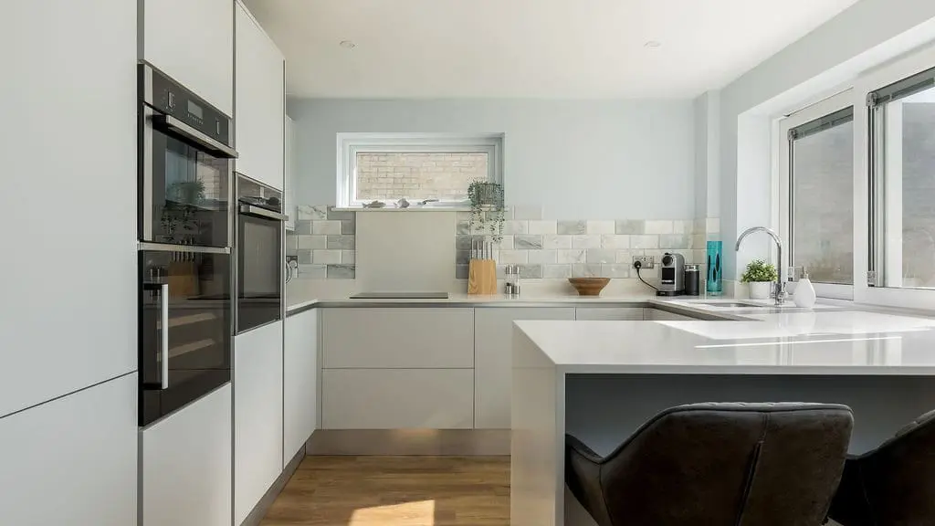 Kitchen with integrated electric oven, hob, fridge and freezer, dishwasher, wine fridge and espresso machine. Breakfast bar with three stools