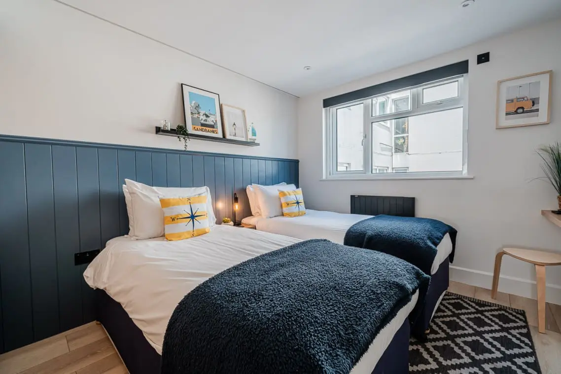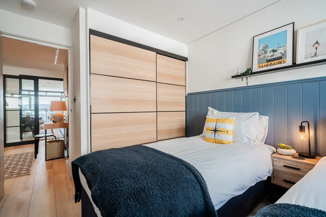 Bedroom 3 – Twin beds, feature wood slat wall, fitted wardrobe and TV