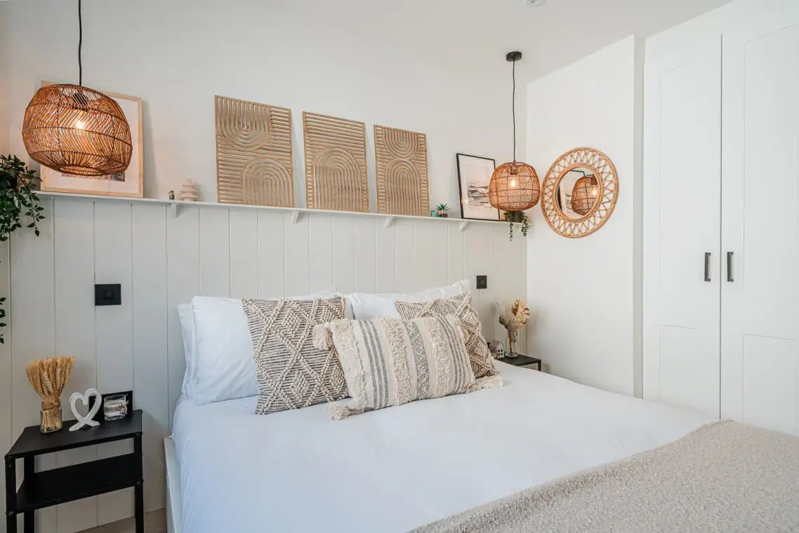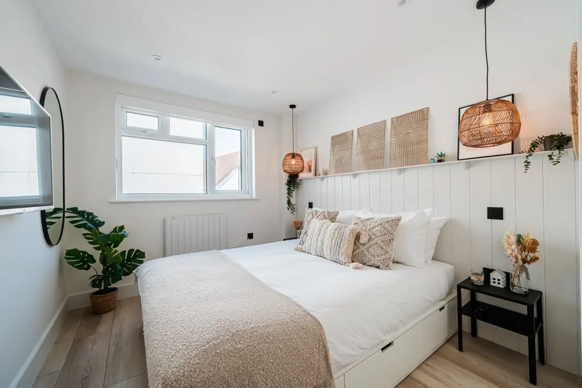 Bedroom 2 – King size bed, feature wood slat wall, fitted wardrobe and TV
