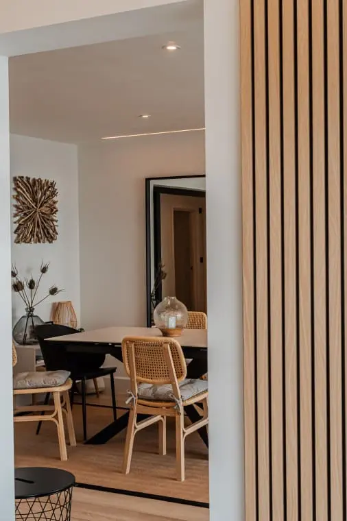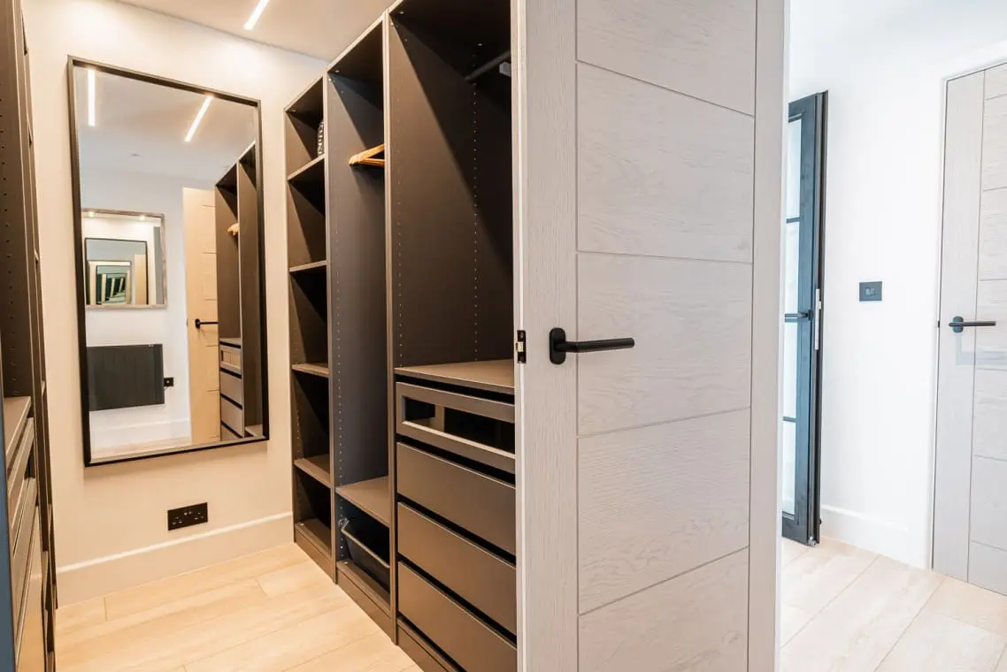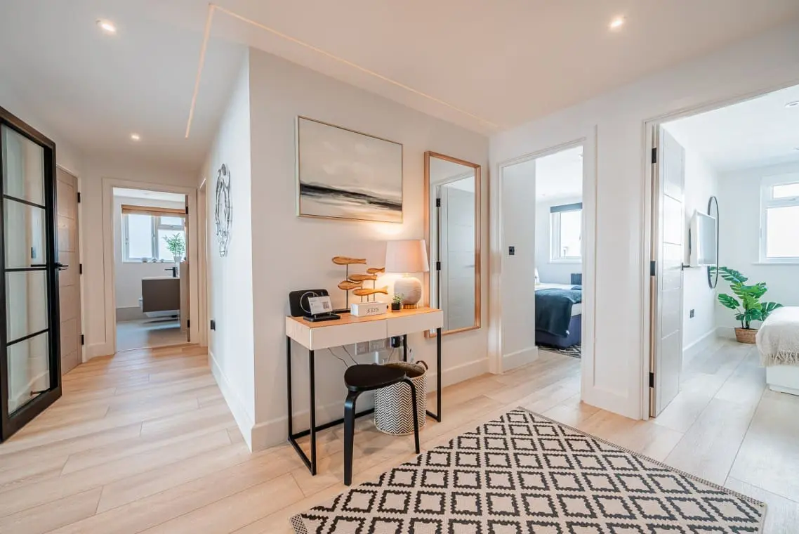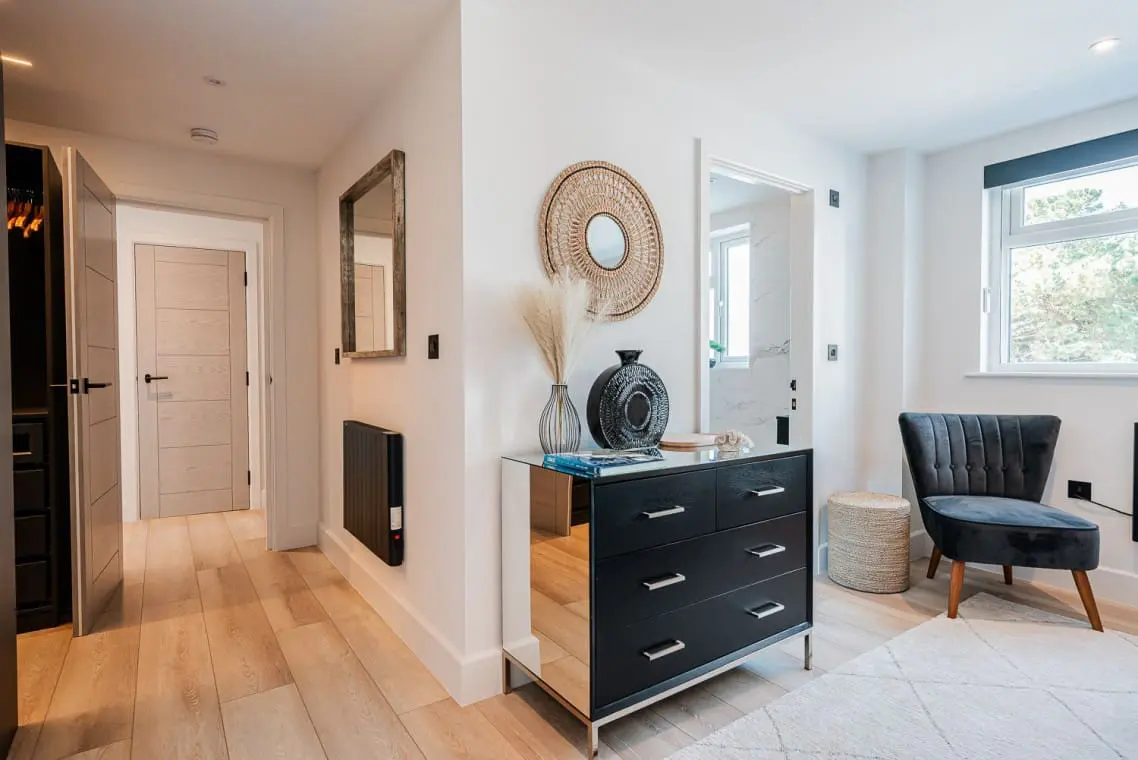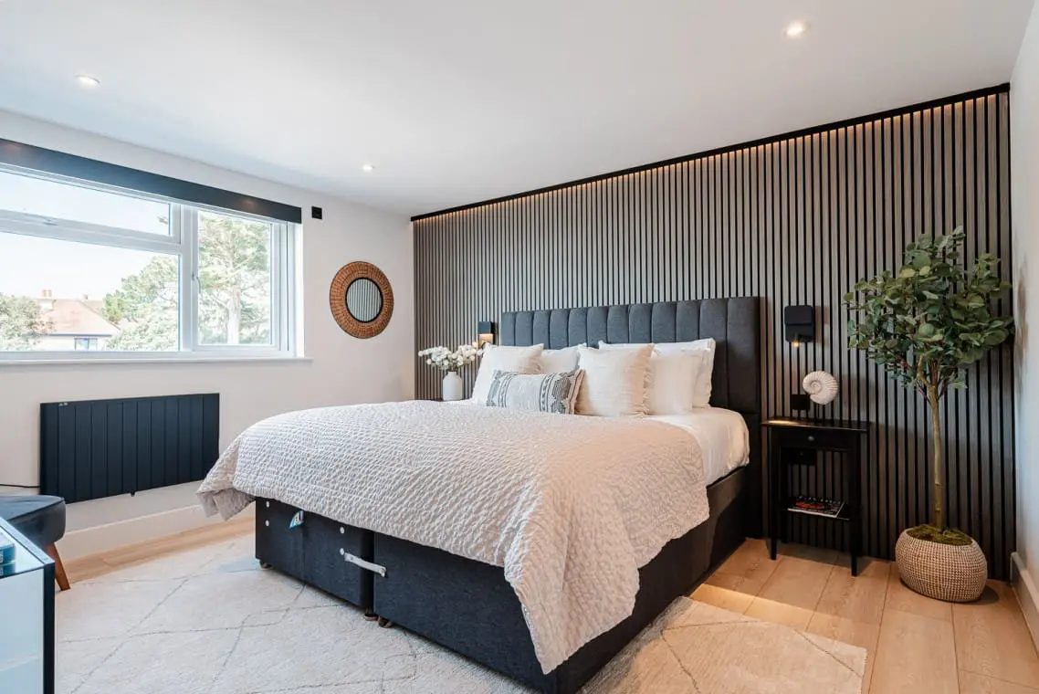 Master Bedroom – with Superking bed, feature wood slat wall, LED lighting, electric blinds, dressing area and marble effect ensuite with walk in shower, vanity basin and W/C