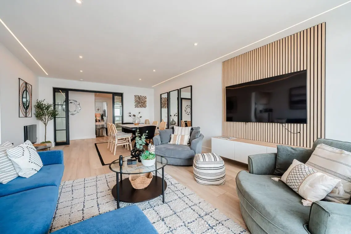Living and dining room with doors leading onto the front balcony – dining table and lounge seating for six, large TV with SKY, recessed LED lighting and electric blinds