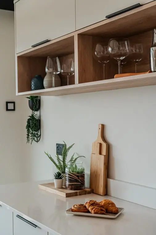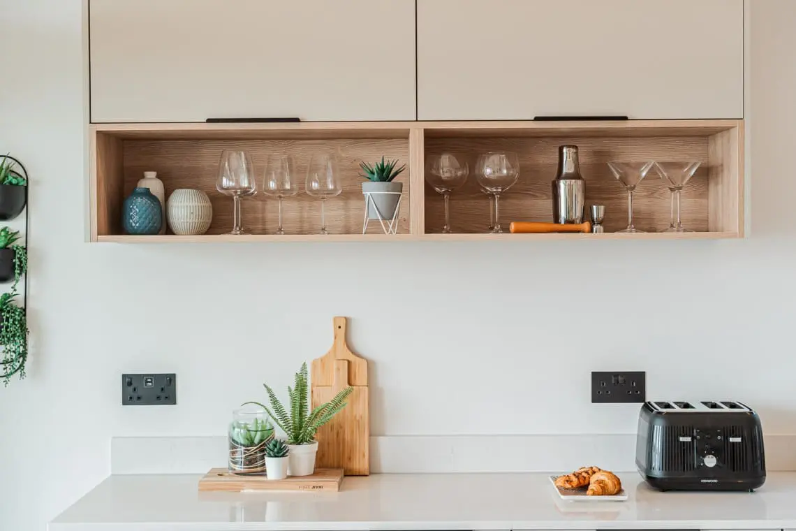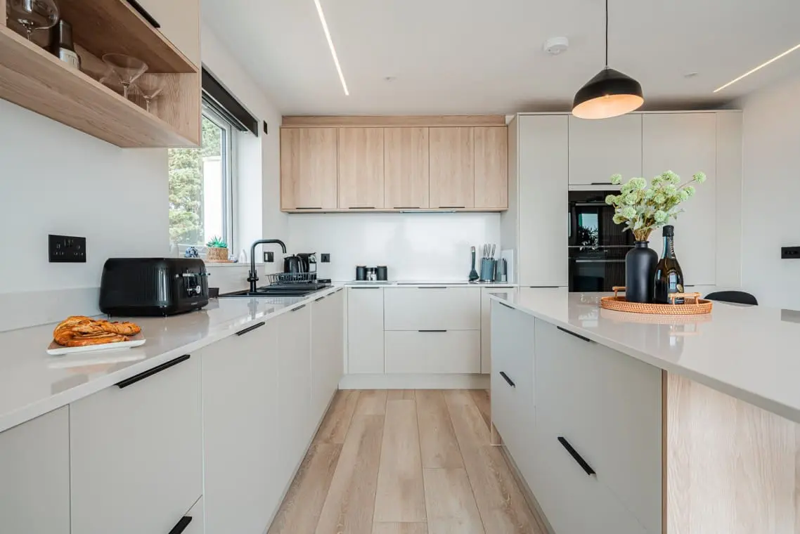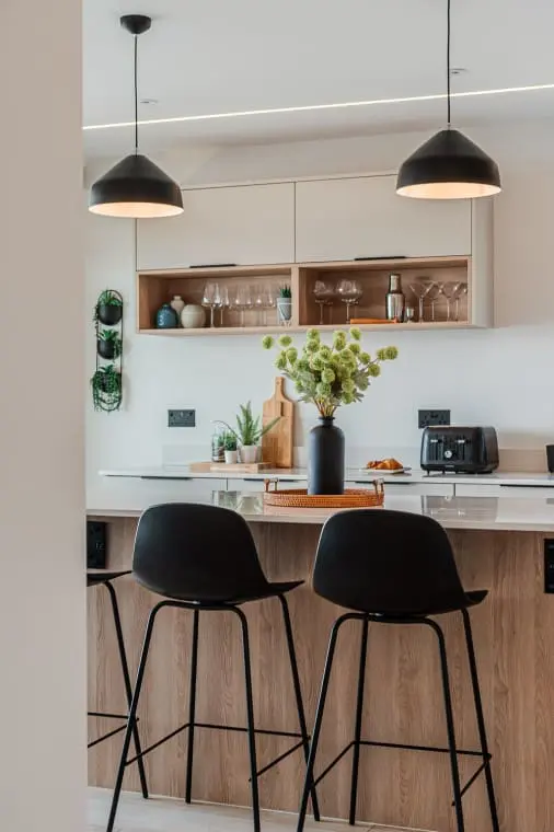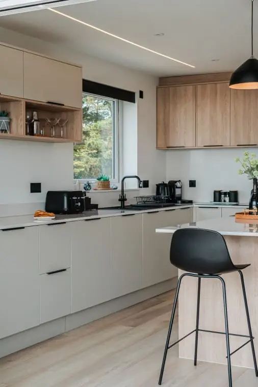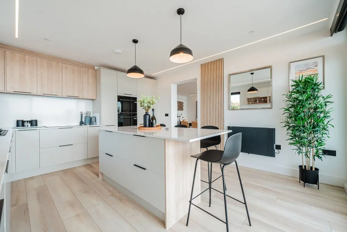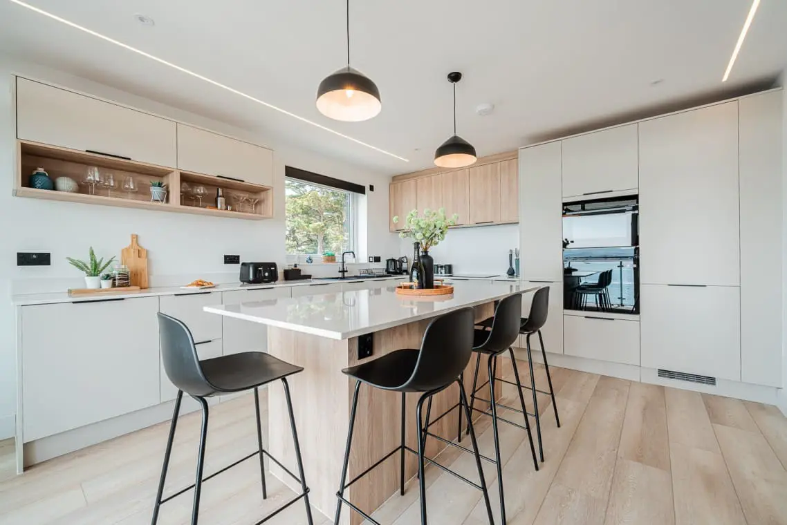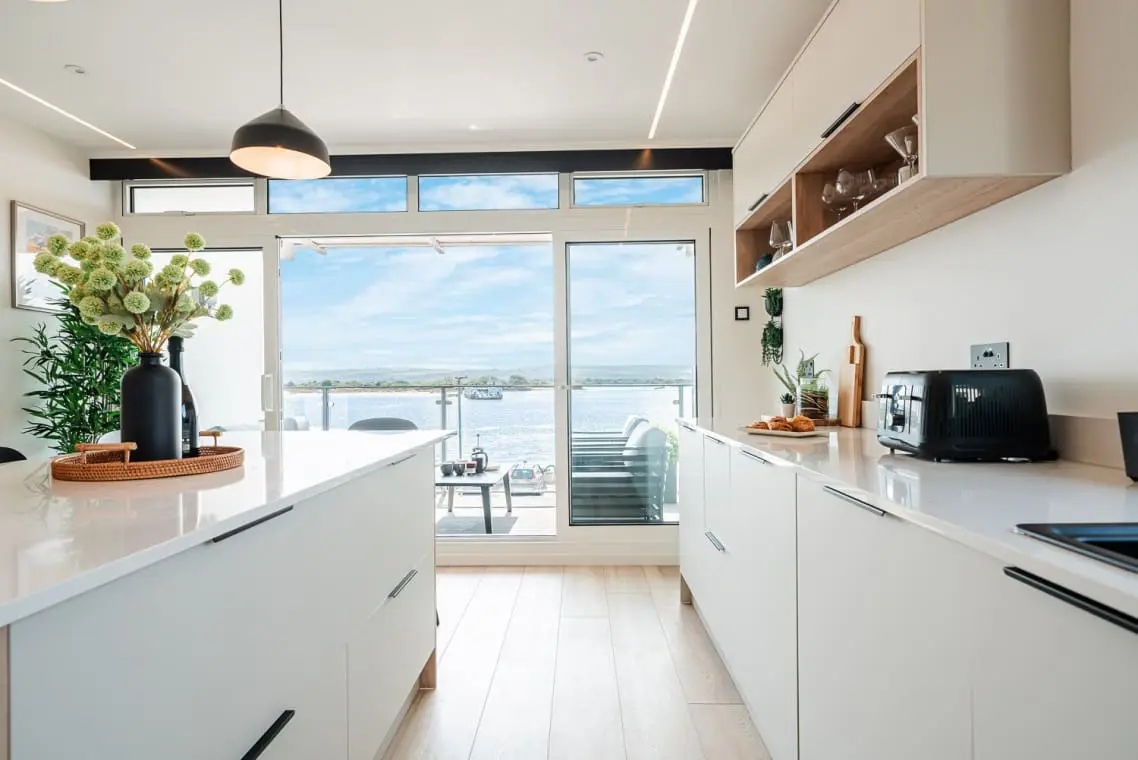 Kitchen with patio doors leading onto the front balcony – newly fitted with island breakfast bar with seating, Incorporating a large fridge and separate freezer, oven and combi microwave,air fryer, nespresso coffee machine. Electric blinds