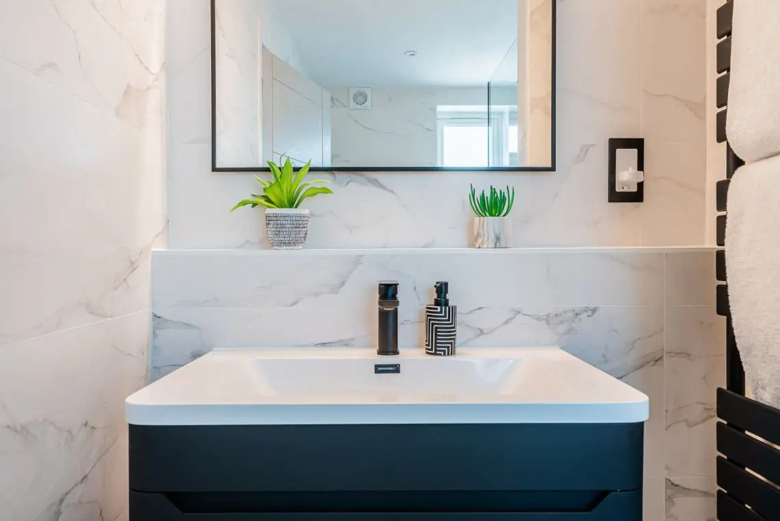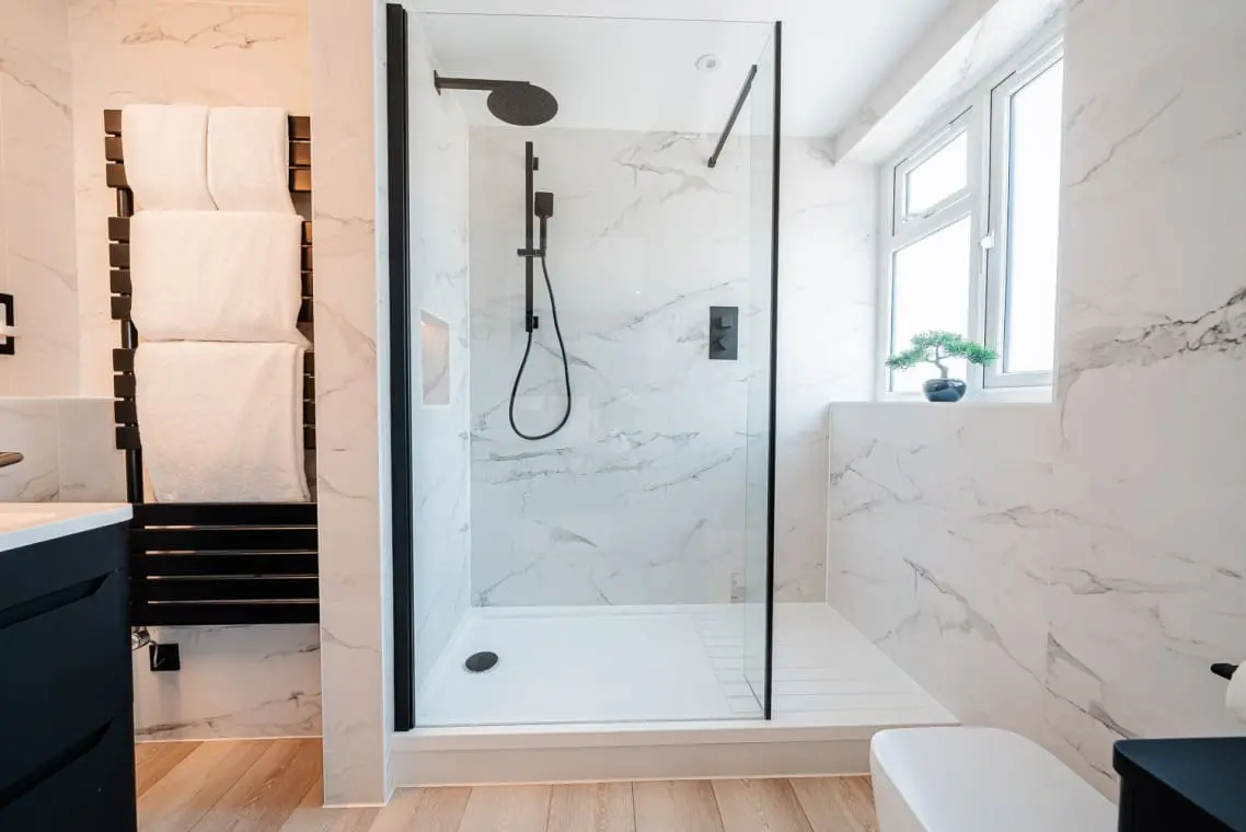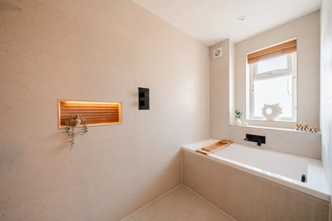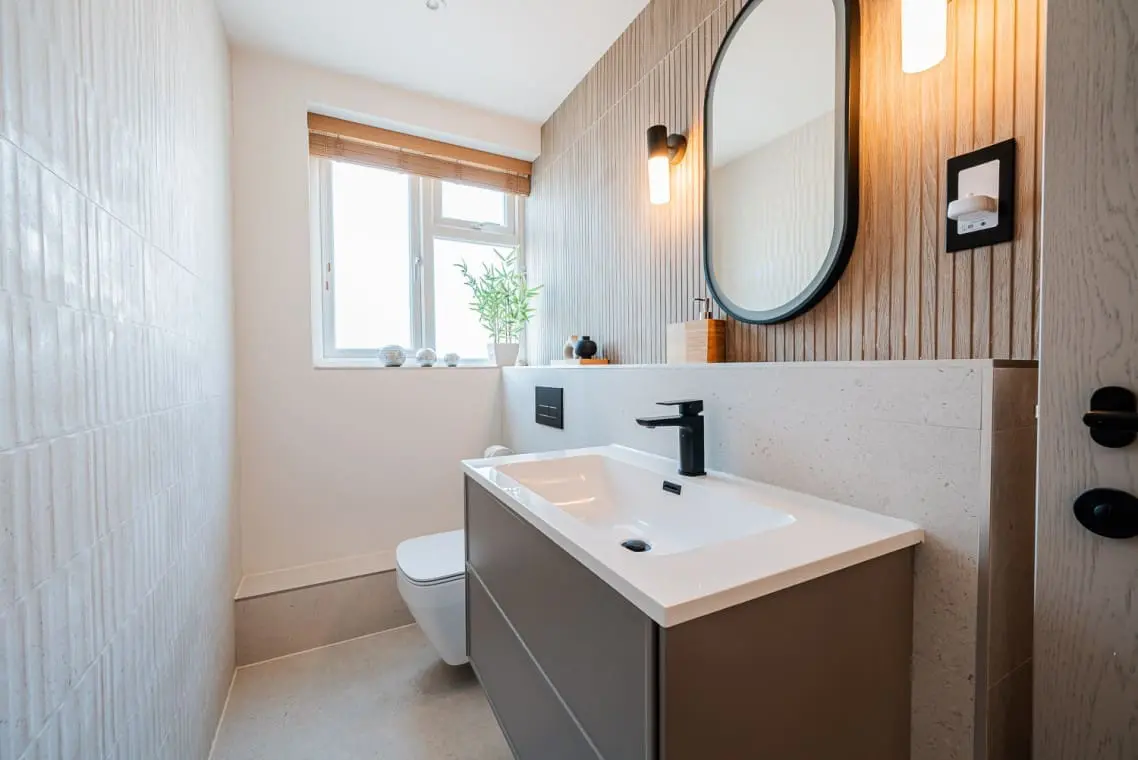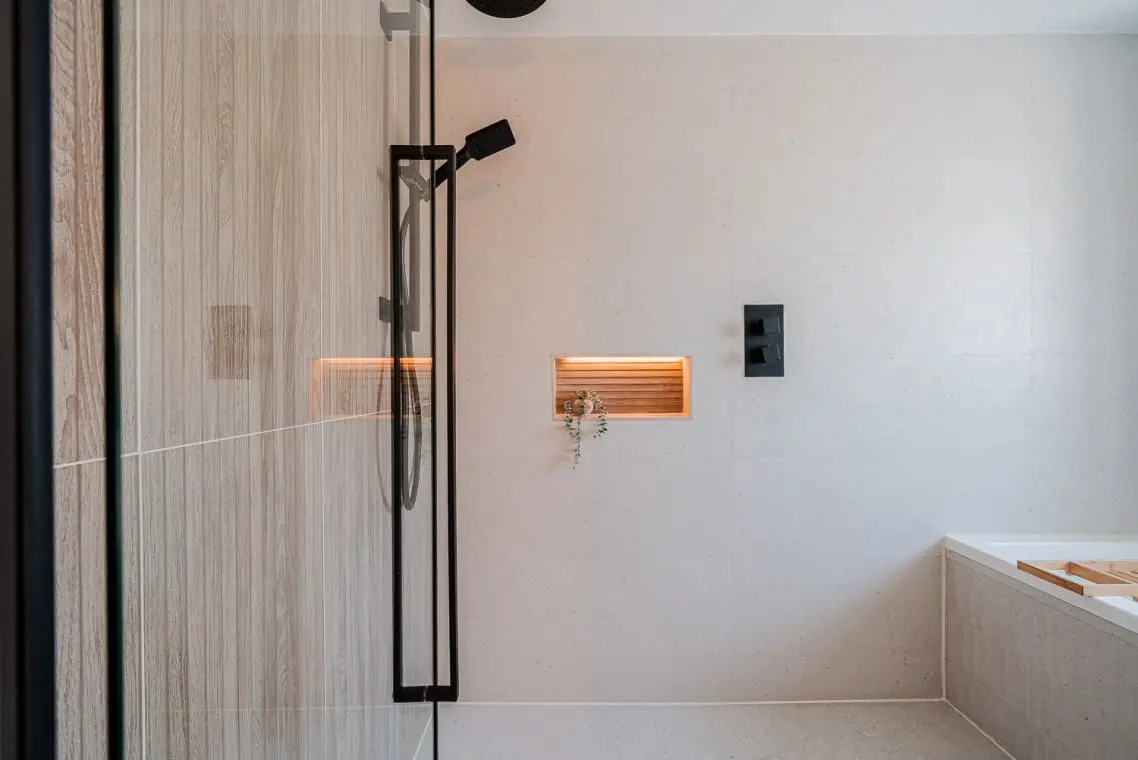 Main Bathroom – Walk in wet room shower and Skandi style vanity basin and W/C area