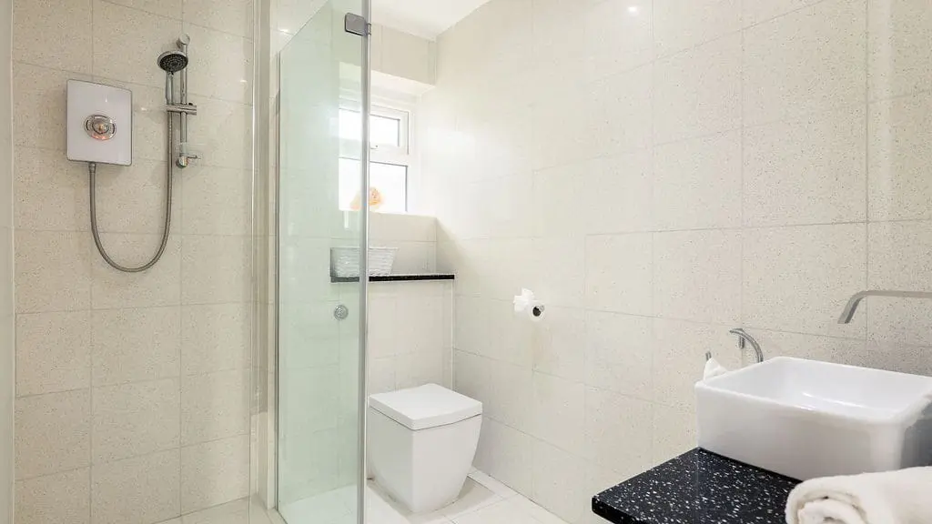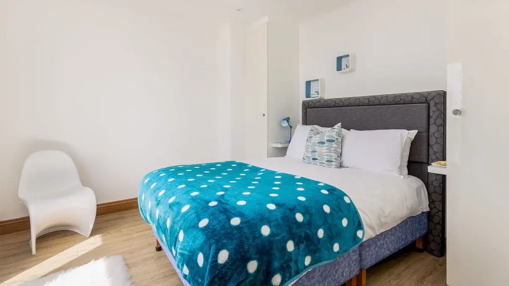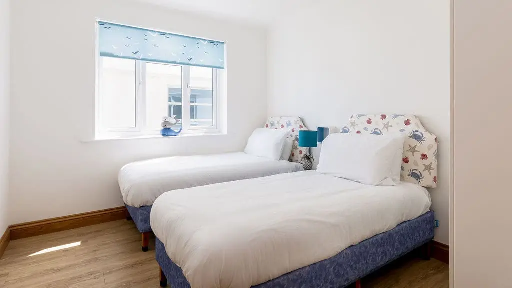 The master bedroom features a king-size bed and lovely views, while the second bedroom is a generous twin. Both share a stylish shower room, complete with a contemporary walk-in wet room.