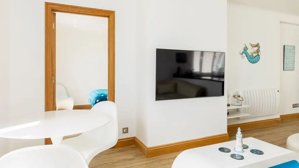 Beautifully presented throughout, the apartment sleeps up to four guests in two comfortable bedrooms. The open-plan living, dining, and kitchen area is a bright and airy space, enhanced by double doors and a Juliette balcony that invite the sea breeze indoors. The well-equipped kitchen includes modern fitted appliances such as a dishwasher and washing machine, all seamlessly integrated into the sociable layout.