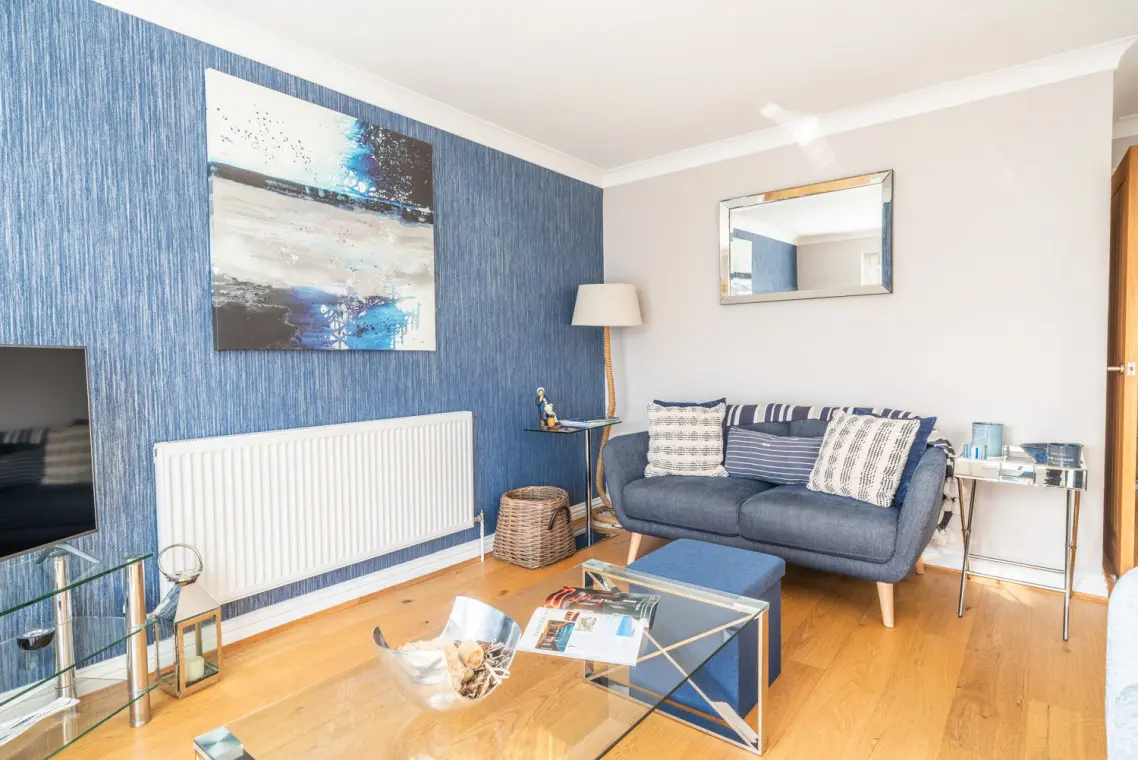 A smart, fresh, and beautifully decorated bijou apartment with a chic nautical theme, boasting ever-changing sea glimpses from the living area and balcony.