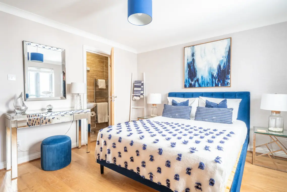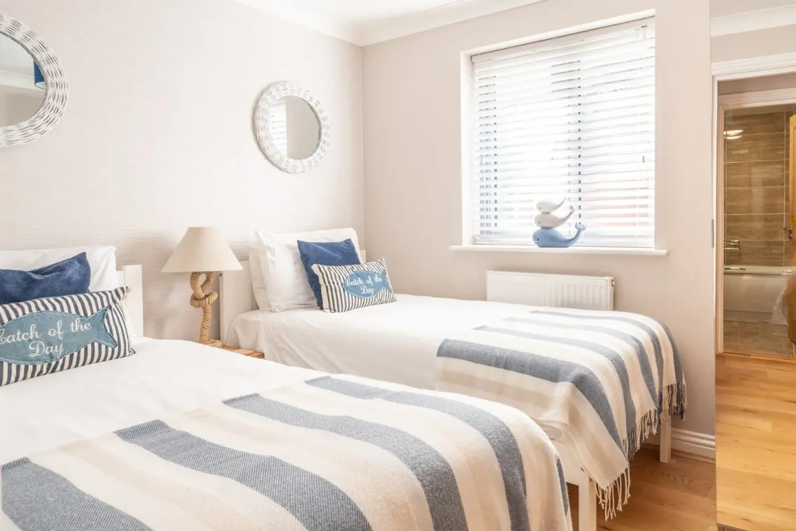 It sleeps four across two bedrooms: a master king-size bedroom with an ensuite shower room, and a second twin bedroom serviced by a family bathroom.