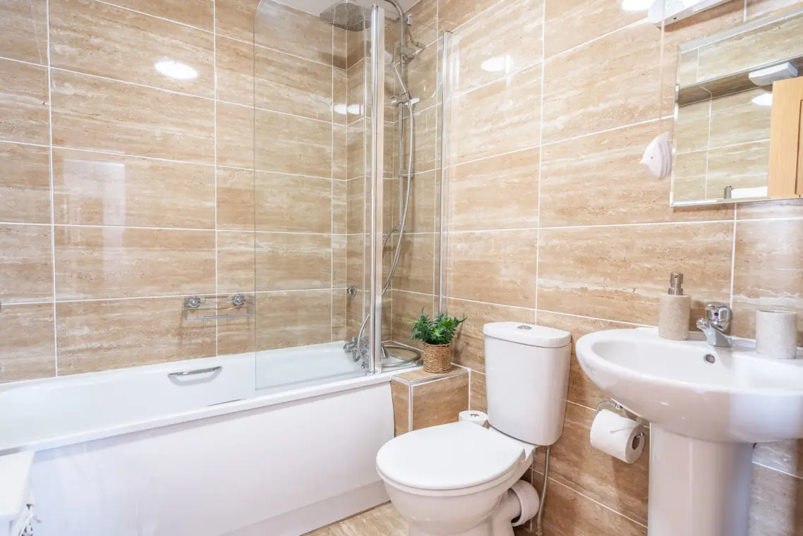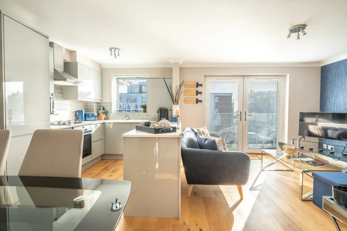 The open-plan living, kitchen, and dining area is at the front of the apartment. The well-equipped kitchen includes a large fridge freezer, oven, hob, microwave, washer dryer, and a dishwasher.