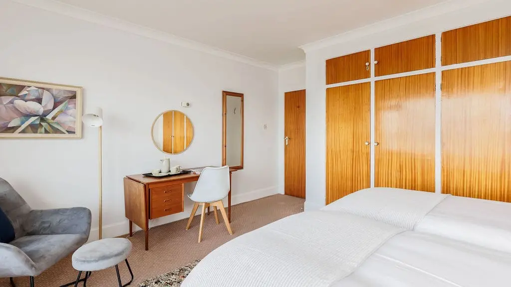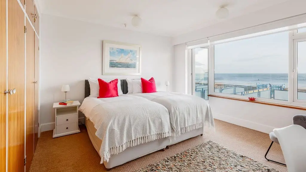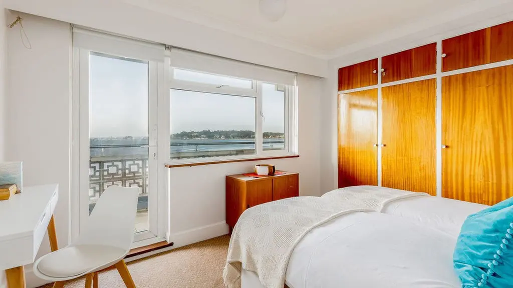 The master bedroom (configured as a super king or twin on request) also enjoys breathtaking sea views and access to the terrace—wake up to the sound of the waves and the sight of the ocean. The second bedroom is a comfortable twin with views over Poole Harbour and direct access to a private balcony, making it the perfect spot to watch the sunset.