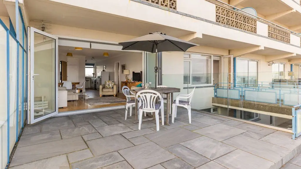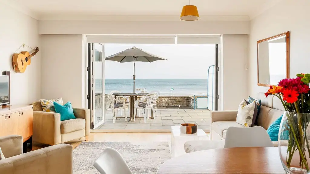 The open-plan living, dining, and kitchen area is light, spacious, and designed for relaxed beachside living. Bi-fold doors open out onto a generous private terrace, offering sweeping views from the Isle of Wight to Old Harry Rocks—perfect for soaking up the sun, dining al fresco, or stepping straight onto the sand.