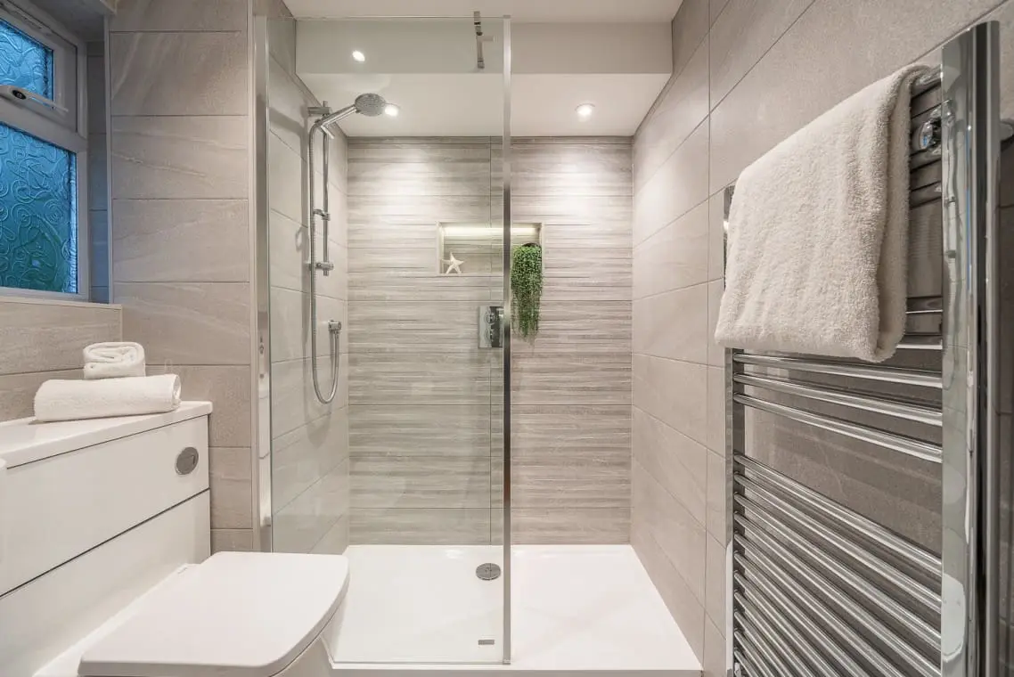 Shower room with walk in shower, basin, heated towel rail and W/C