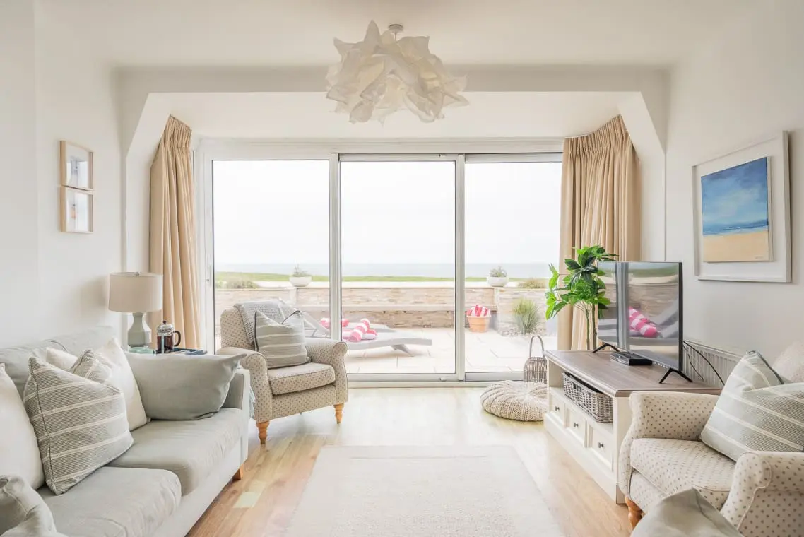 Snug with Seaview – with sofa seating, TV and patio doors leading to a balcony with a table and chairs with a parasol