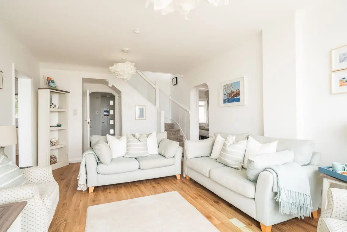 This spacious holiday home comfortably accommodates up to eight guests across two floors and four bedrooms. On the ground floor, you’ll find a large, light-filled living room with patio doors opening onto the front terrace, along with an open-plan kitchen and dining area that leads to a landscaped rear patio. Two well-appointed bedrooms are also located on this floor. Upstairs, a cozy snug opens onto a generous balcony, ideal for soaking in the spectacular sea views.