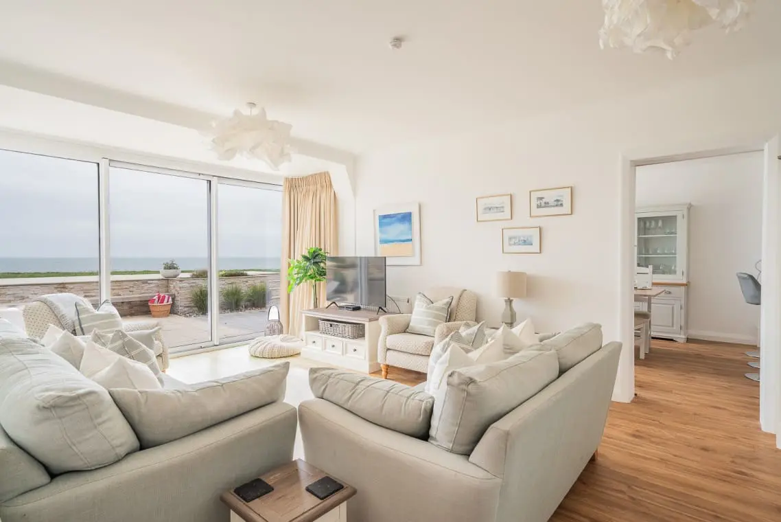 Lounge with Seaview – with sofa and armchair seating, coffee table, TV and patio doors leading to the terrace area