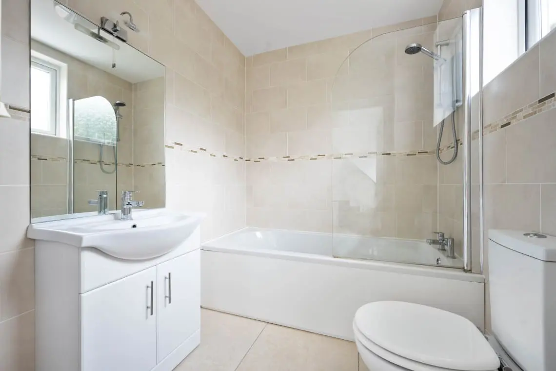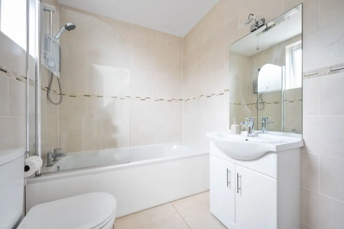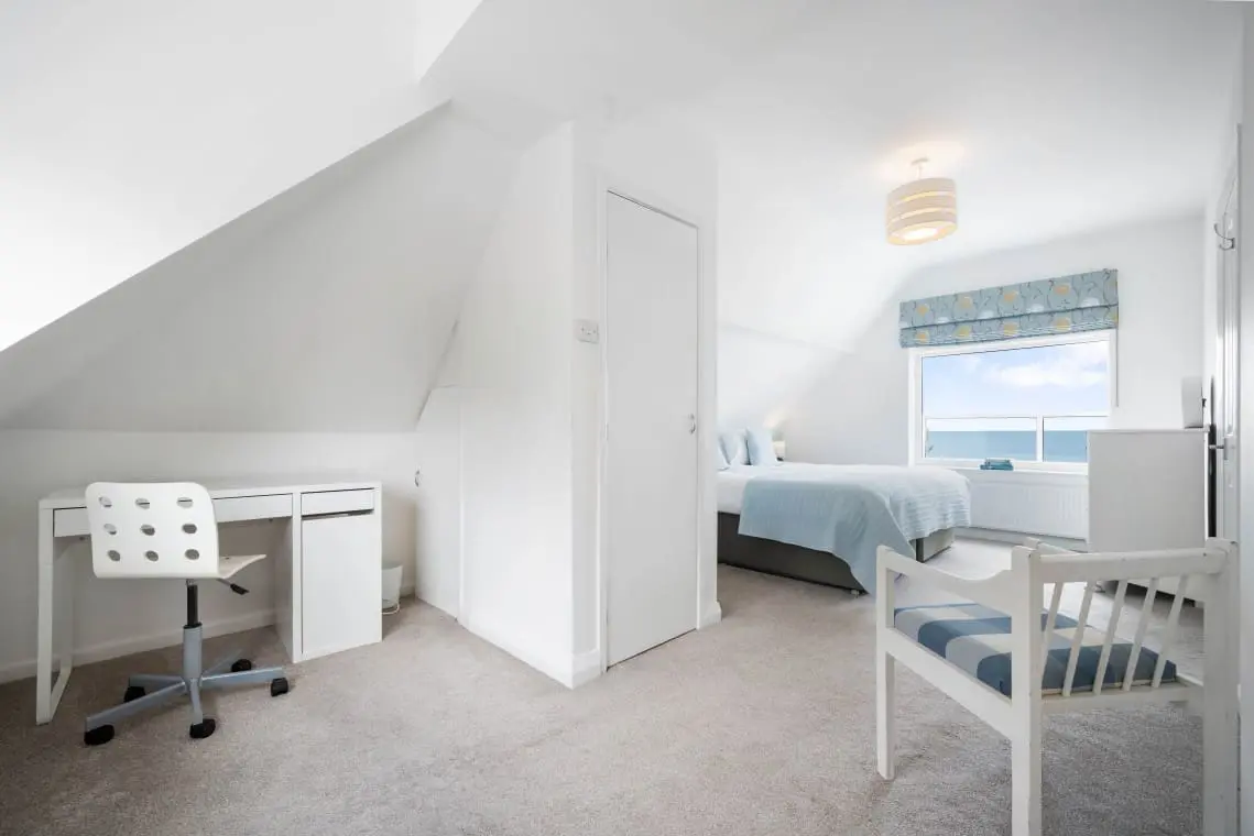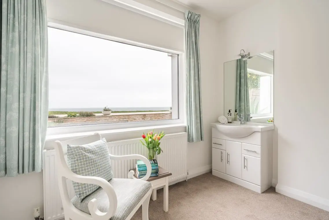 Bedroom 2 – Super King or Twin En suite with Seaview – with bedside tables, chest of drawers, wardrobe and desk. The en suite bathroom has a bath with shower over, basin, heated towel rail and W/C