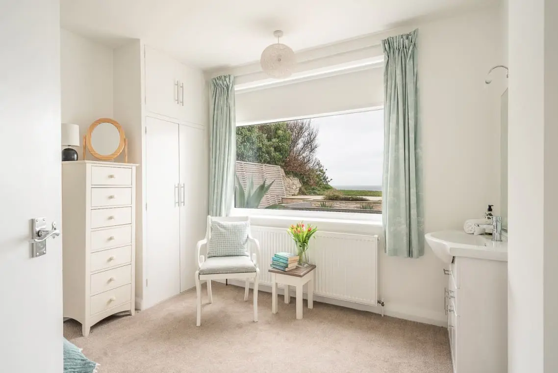 Bedroom 3 – Twin or King with Seaview – with chest of drawers, fitted wardrobe and basin.