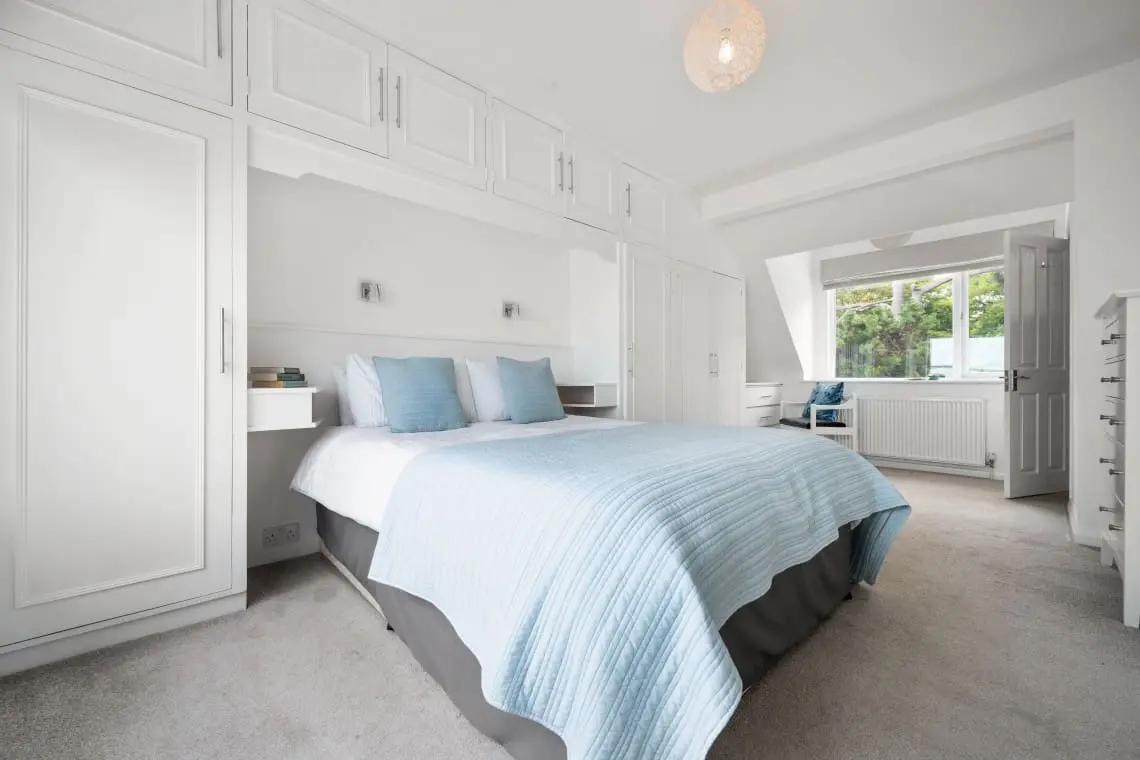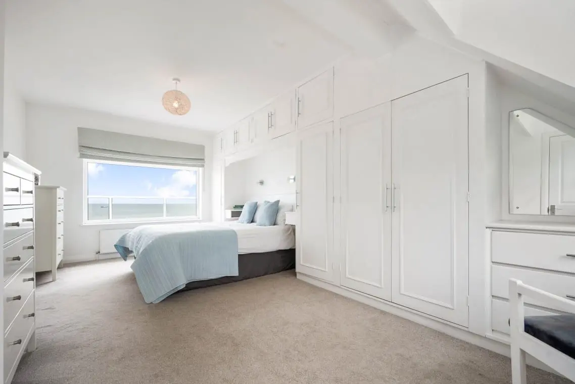 Bedroom 1 – King En suite with Seaview – with fitted wardrobes and bedside tables, 2 chests of drawers. The en suite bathroom has a bath with shower over, basin, heated towel rail and W/C