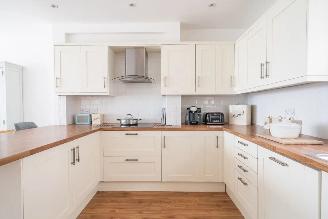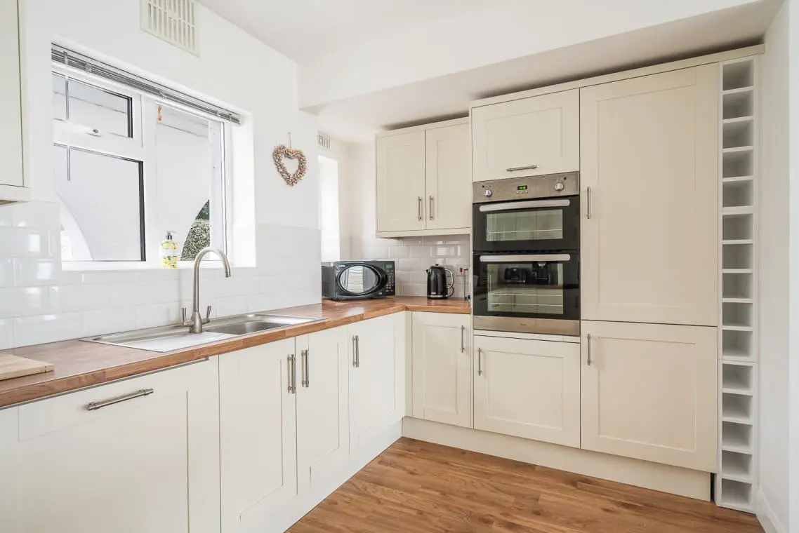 Kitchen and Dining Room – with fitted kitchen including double ovens, hob, fridge freezer, and dishwasher and the breakfast bar has stool seating for three. There is also a kettle, toaster, air fryer, coffee machine, blue tooth speaker.
