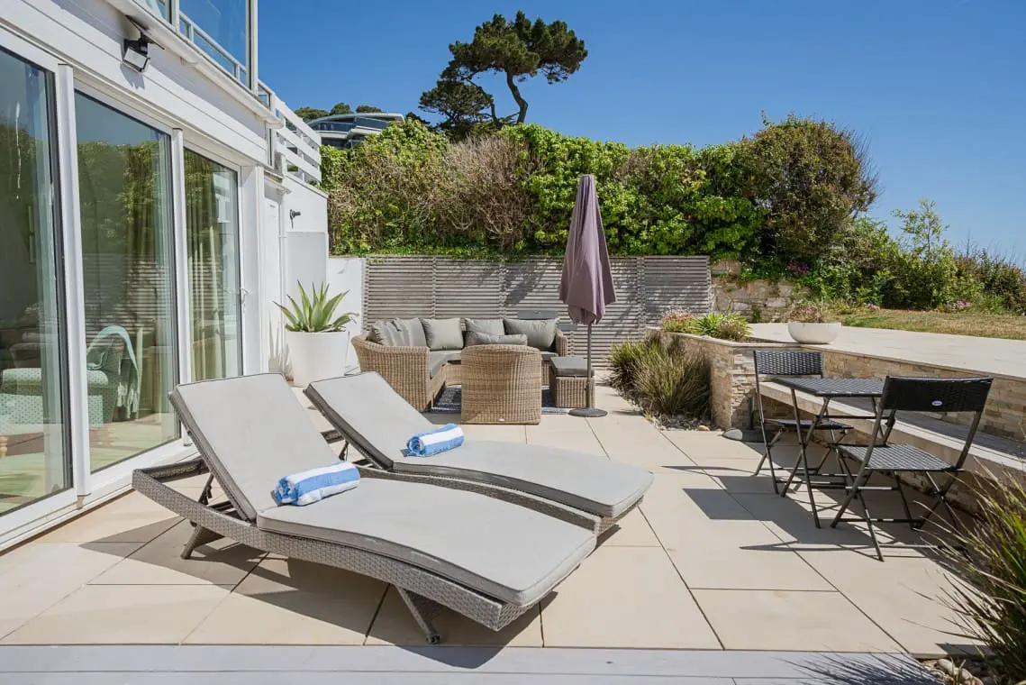 A large, landscaped sea facing patio area with ornamental planting. bistro table and chairs, two sun loungers, rattan garden sofa and chairs with glass top table, parasol and gas BBQ and outdoor shower. The terrace leads to a lawned area providing direct beach access along a pathway (approximately 8 steps down) and through the beach huts to the promenad.
