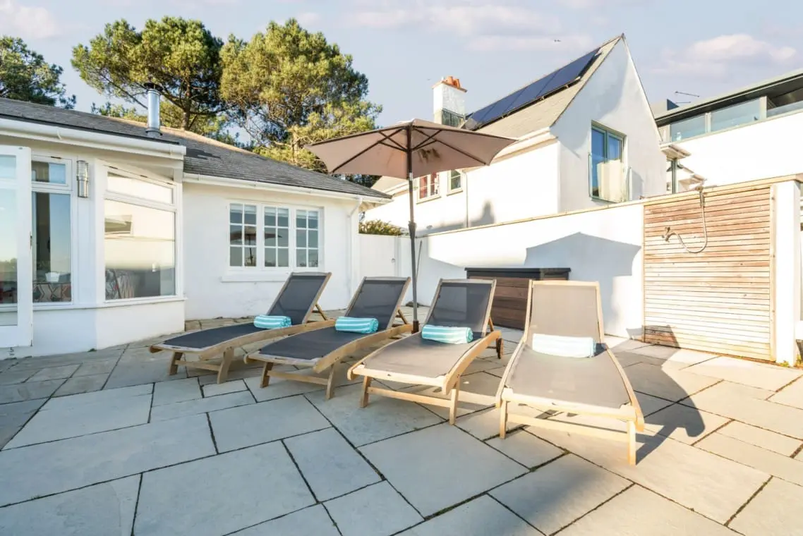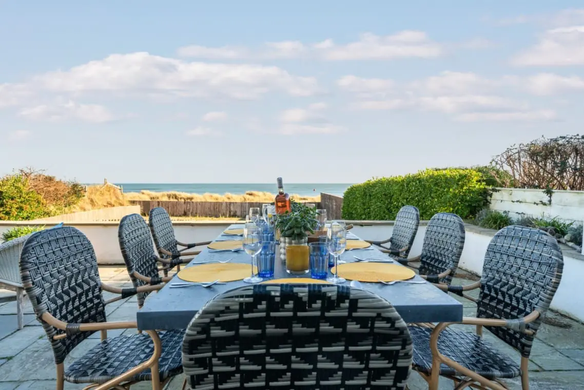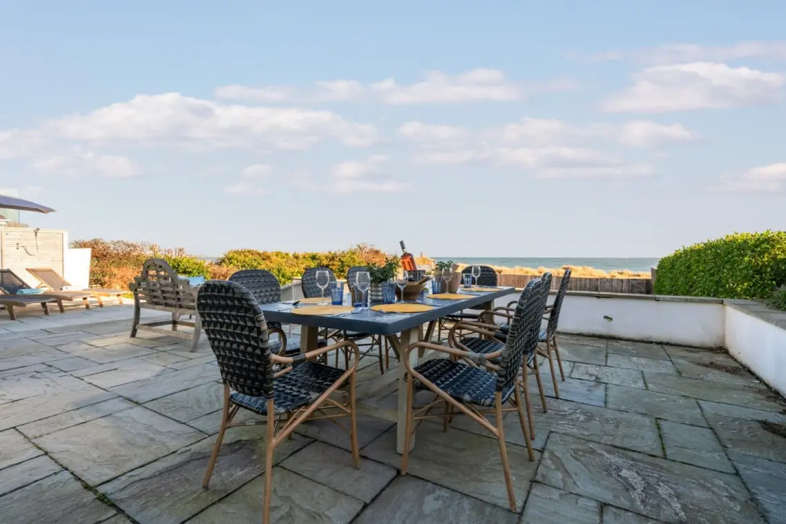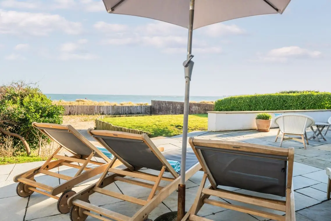 To the rear of the house, there is a private patio area with a selection of deck chairs and sun loungers and outdoor dining for eight an open fireplace, gas and charcoal BBQ. The garden is part lawned and part sand dune with a gate leading directly to the beach.