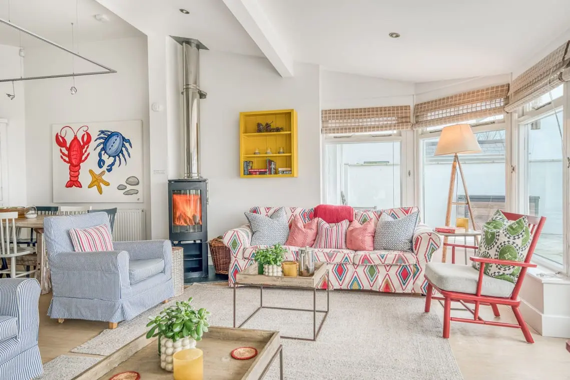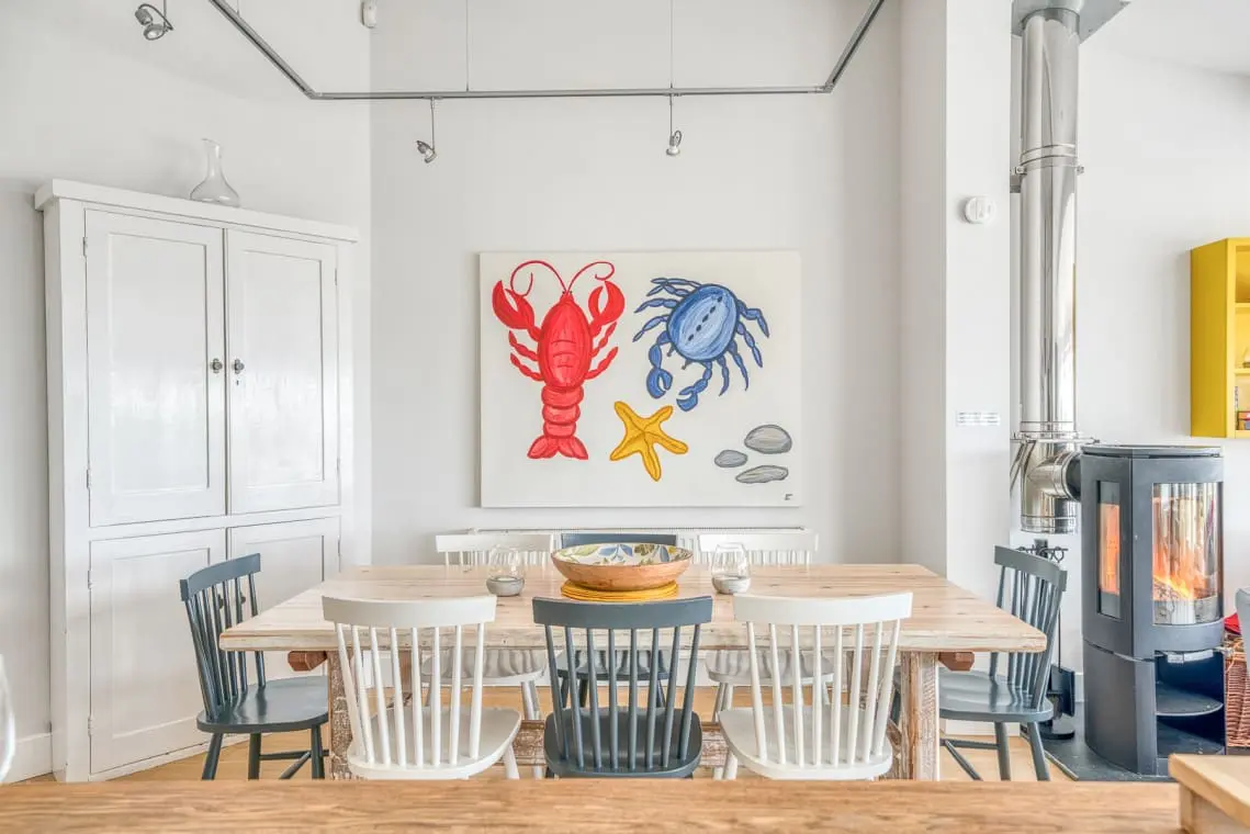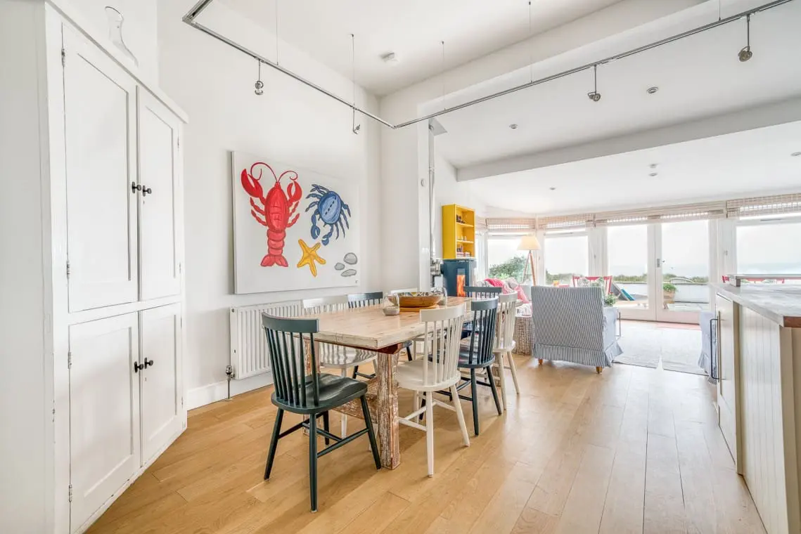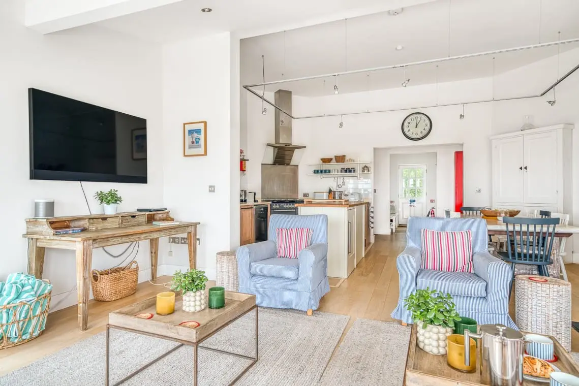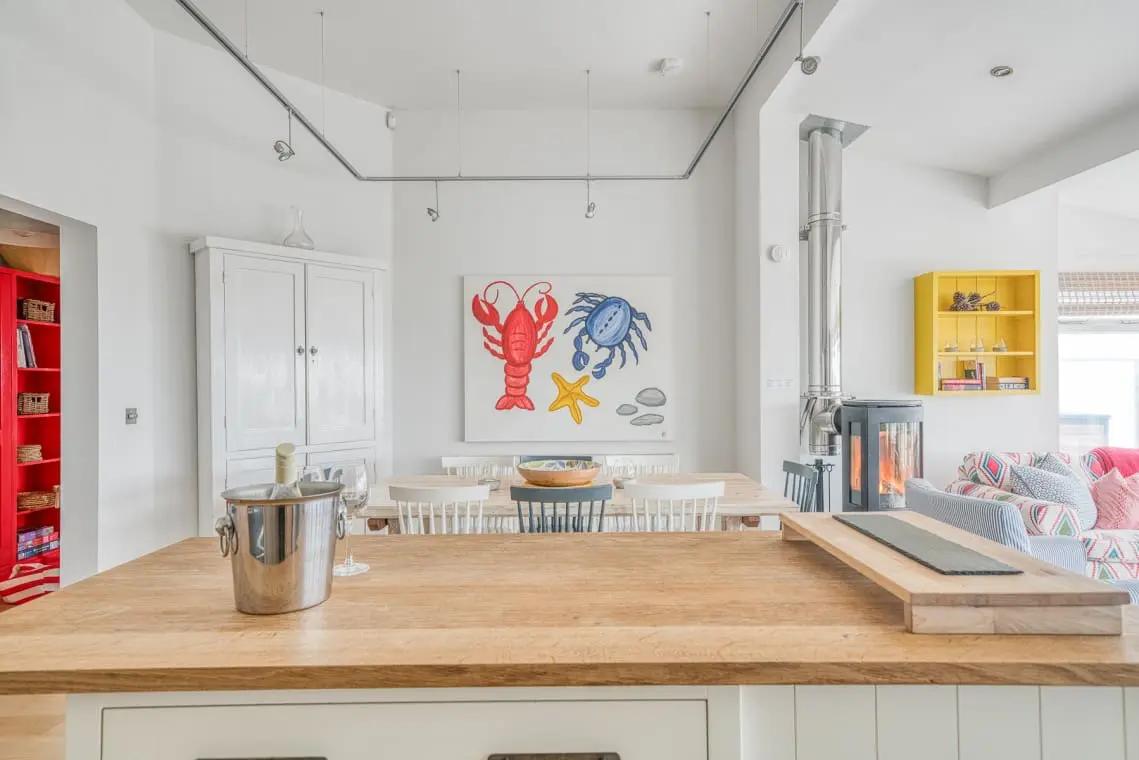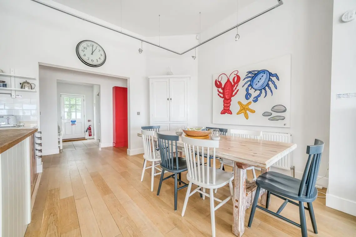 At the heart of the home is the open-plan living, dining, and kitchen area, a welcoming space featuring vaulted ceilings, a cozy log burner, and doors leading to the garden and beach beyond. Four beautifully designed, seaside-inspired bedrooms accommodate up to eight guests, and dogs are warmly welcomed in this delightful family retreat.