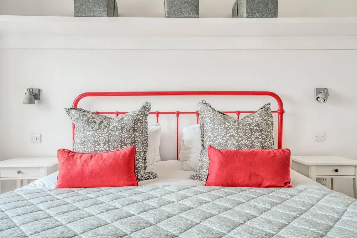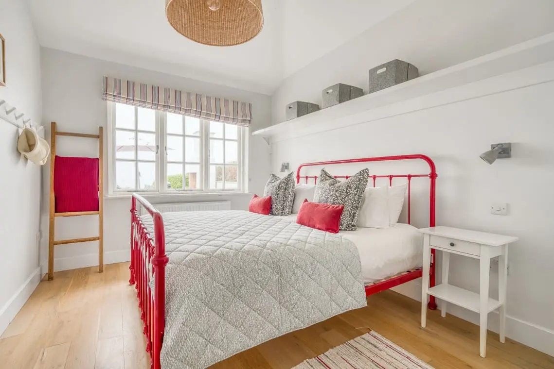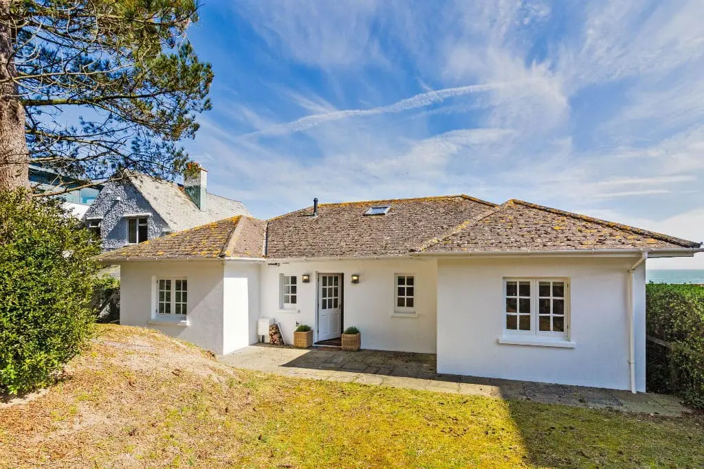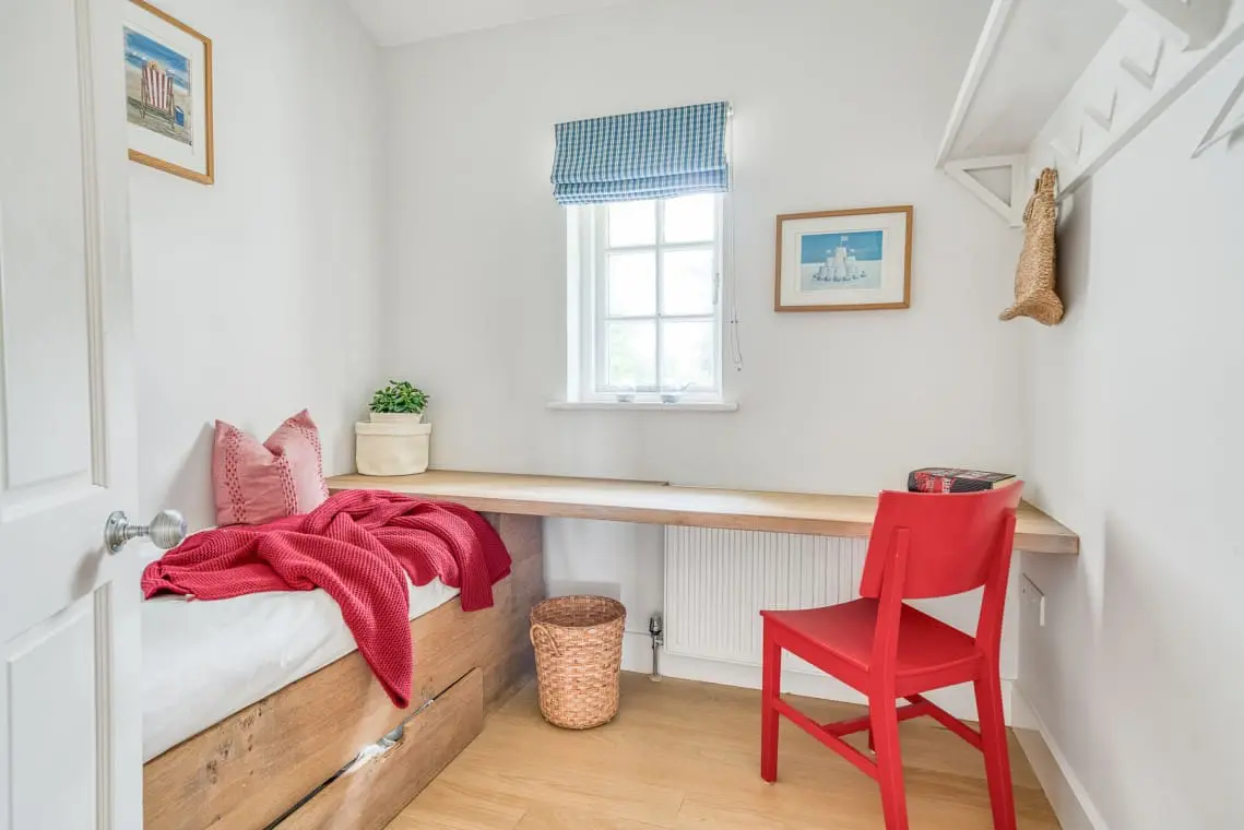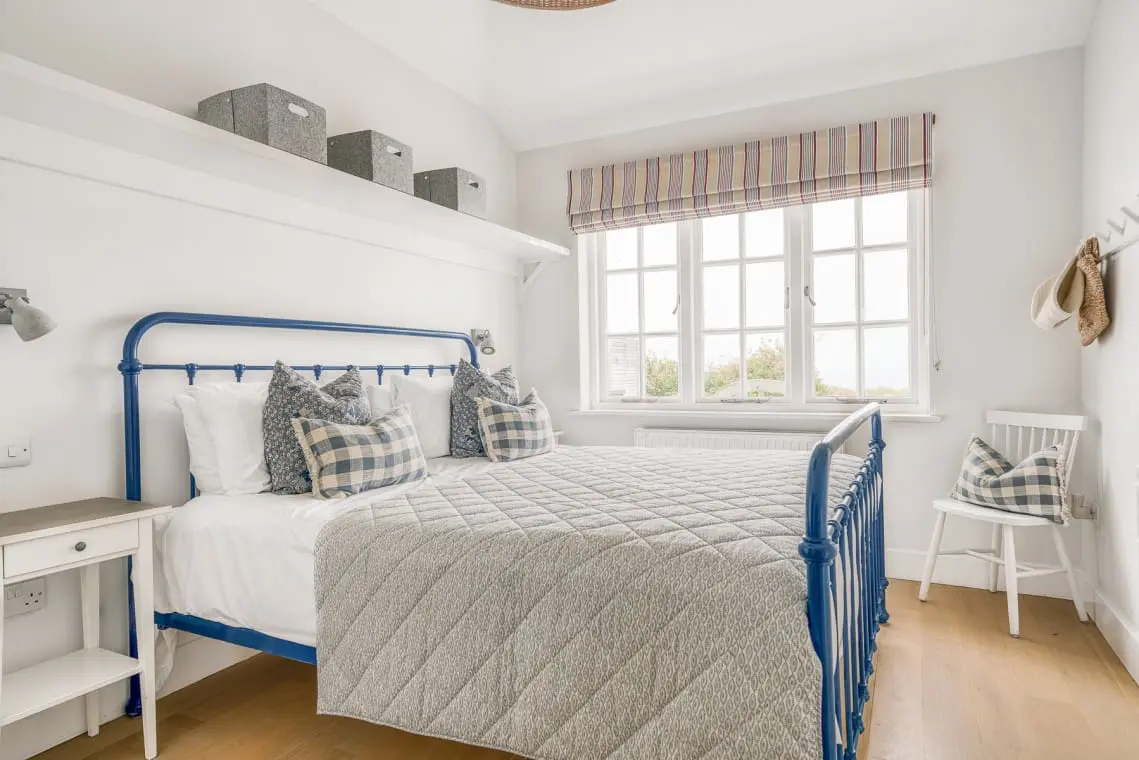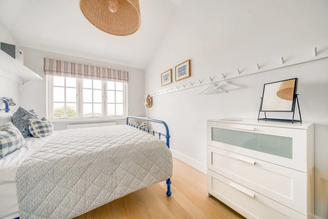 At the heart of the home is the open-plan living, dining, and kitchen area, a welcoming space featuring vaulted ceilings, a cozy log burner, and doors leading to the garden and beach beyond. Four beautifully designed, seaside-inspired bedrooms accommodate up to eight guests, and dogs are warmly welcomed in this delightful family retreat.