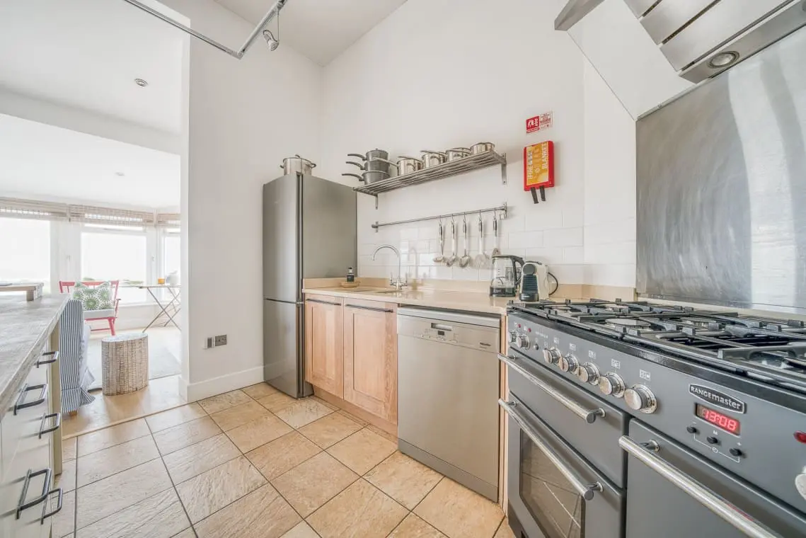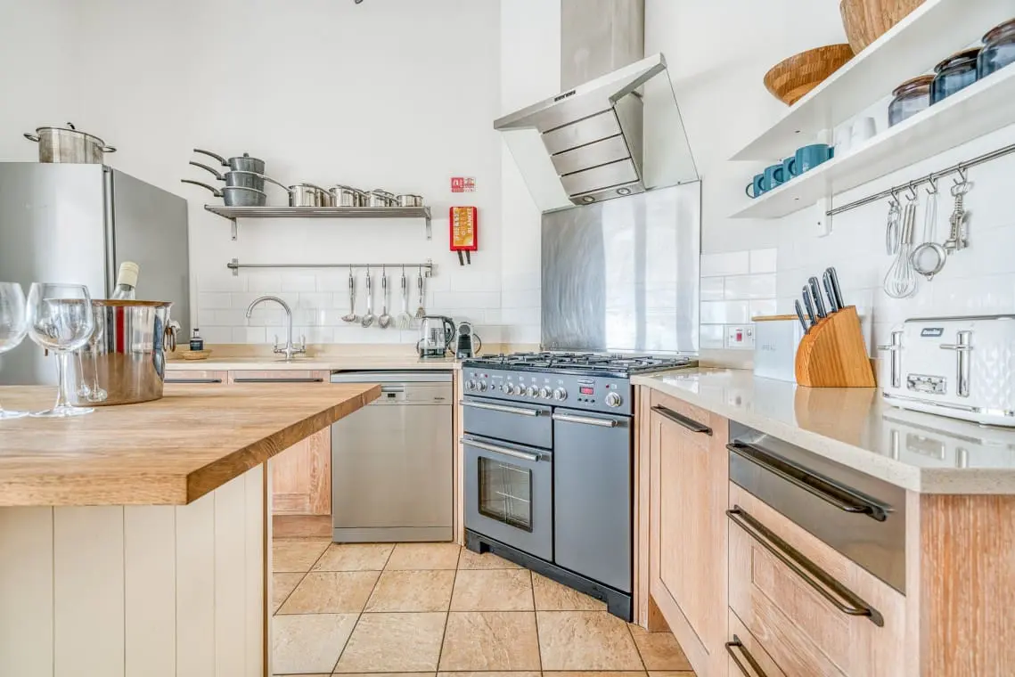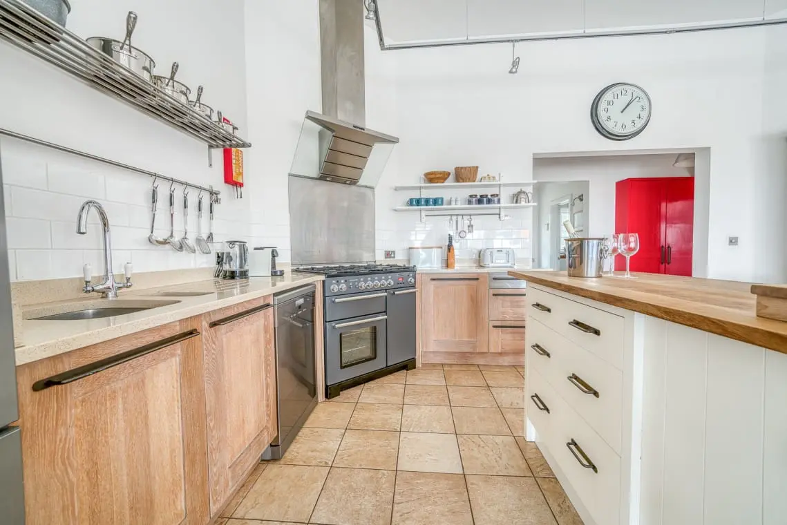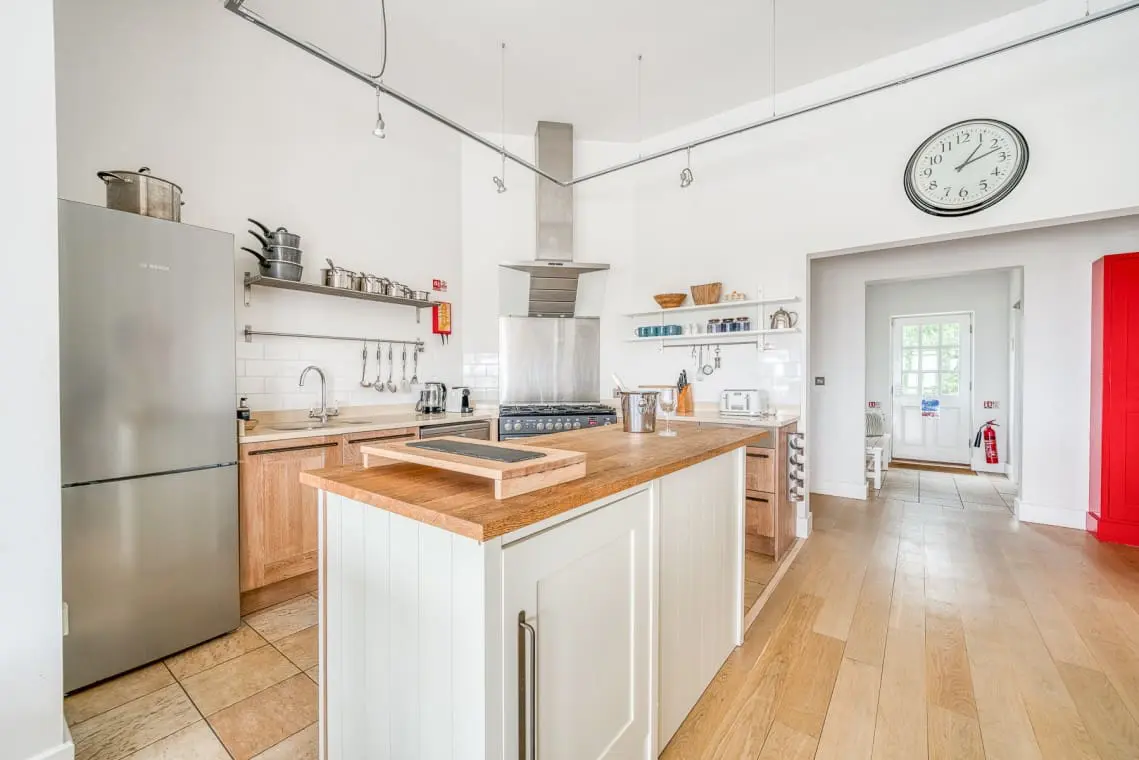 This large room with vaulted ceiling has a fitted kitchen with a range cooker, freestanding fridge freezer and second undercounter fridge in the kitchen island.