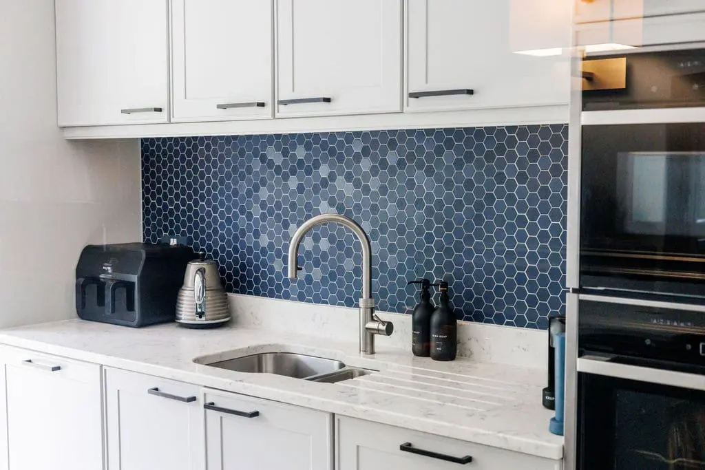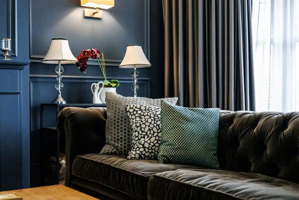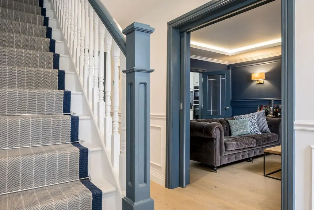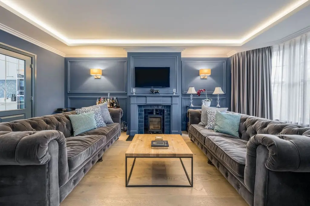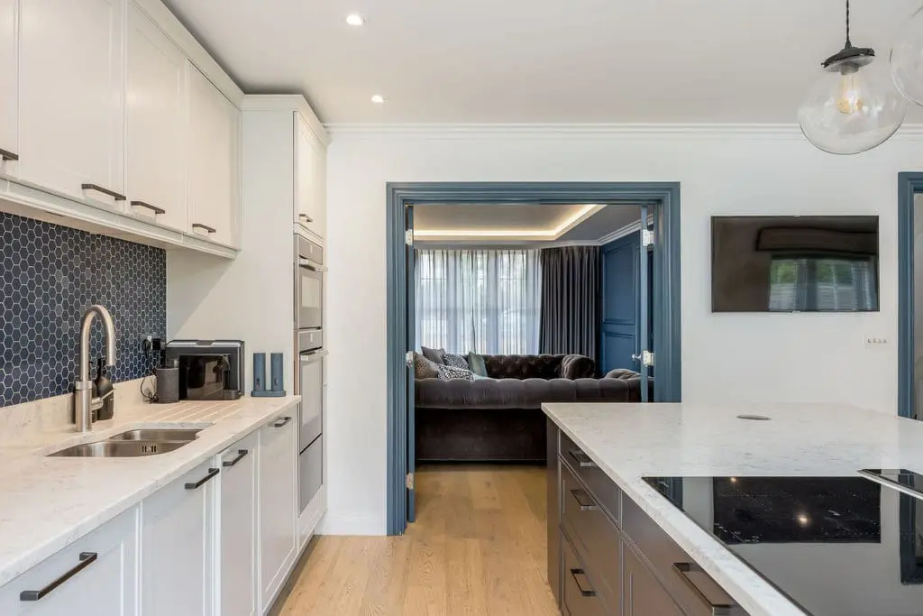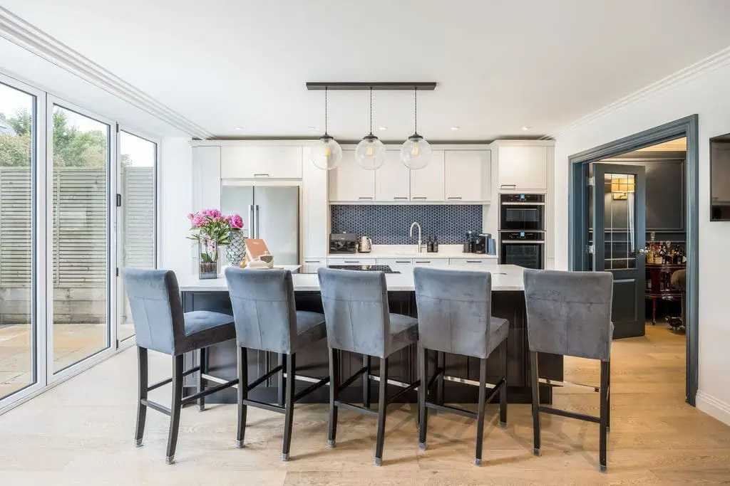 The kitchen – overlooks the garden to the rear of the house. It is vibrant and well stocked with fully integrated appliances, wine chiller and American style fridge freezer. There is also a hidden pop-up plug useful for charging electronic devices on the kitchen island. The breakfast bar island also houses a large hob and extractor as well as stool seating around for 5 guests. Double doors from here can also open into the sophisticated sitting room.