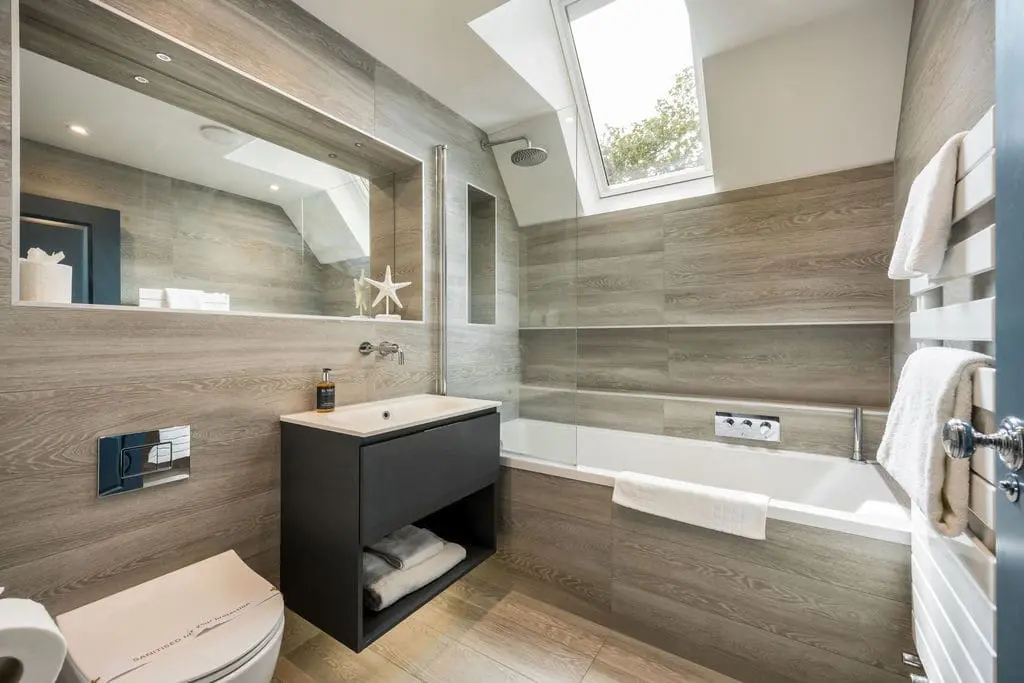 Family bathroom – with bath and shower over, basin with mirror over, heated towel rail and W/C.