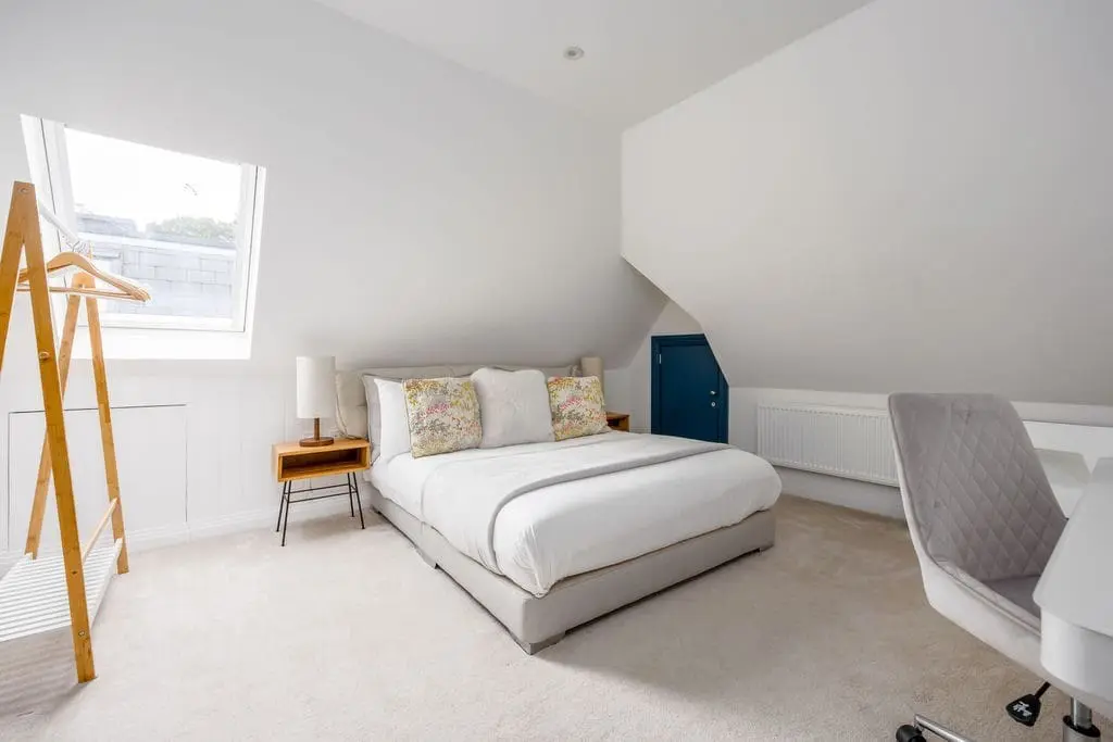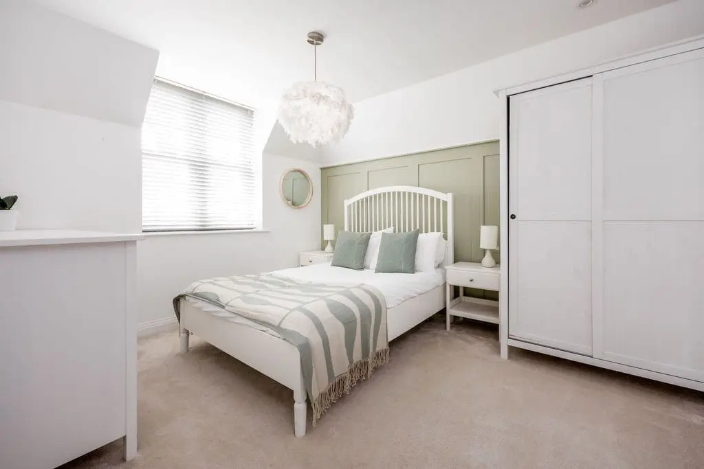 King bedroom – overlooking the front of the house with king bed, bedside tables and wardrobe.