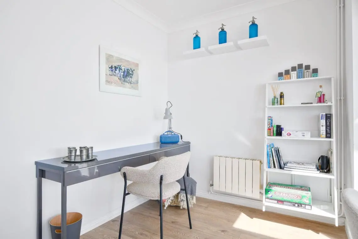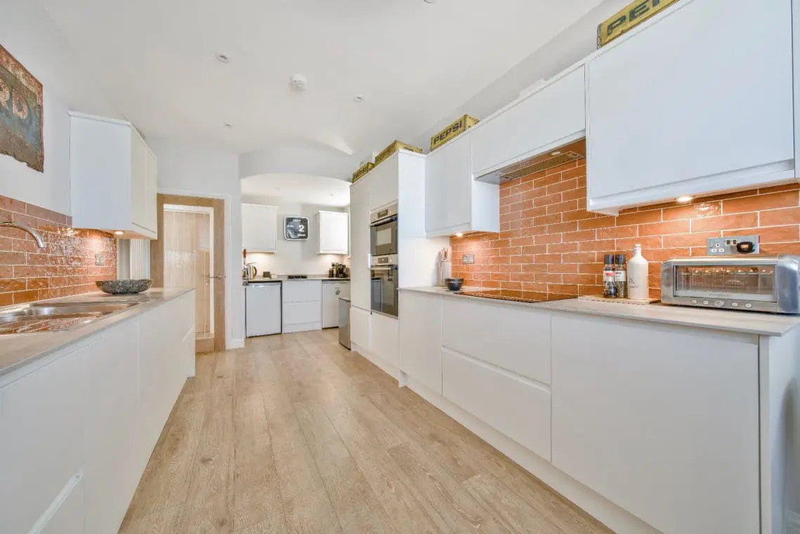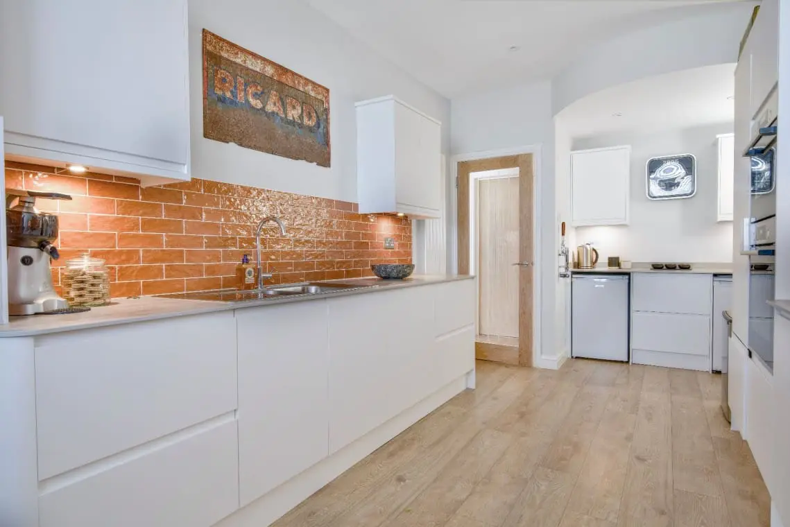 Kitchen – fitted with a hob, oven/grill, combination microwave, fridge freezer, separate larder fridge and freezer and dishwasher. There is also a kettle, toaster, Nespresso coffee machine and juicer. The lovely breakfast bar with stool seating under the window is a lovely spot to enjoy the harbour views