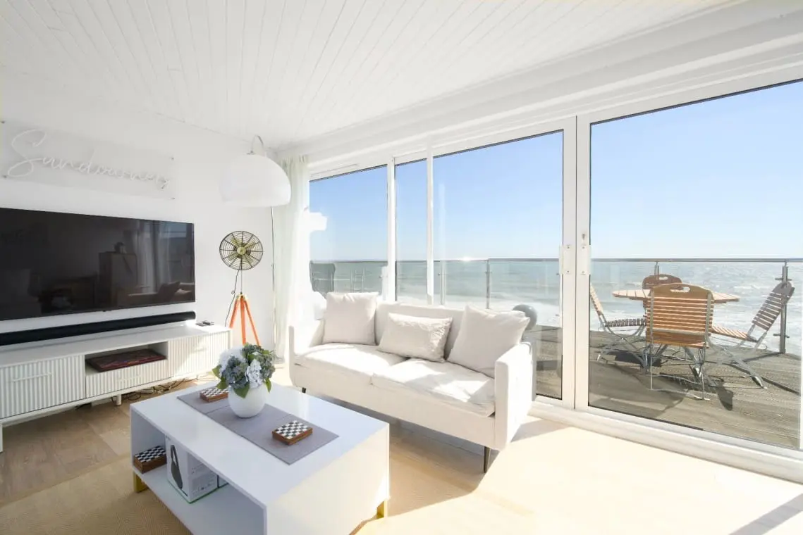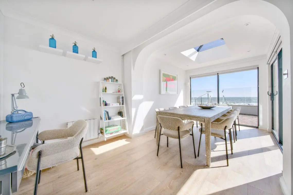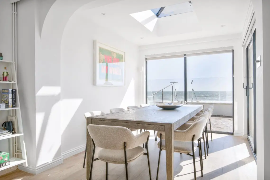 The Open Plan Living and Dining Space with dual aspect views with console table, window seating area, two seater sofa. The living space offers sofa seating for eight guests, large wall mounted Smart TV with Sonos soundbar, coffee and side tables and tri-fold door to the beach side terrace.