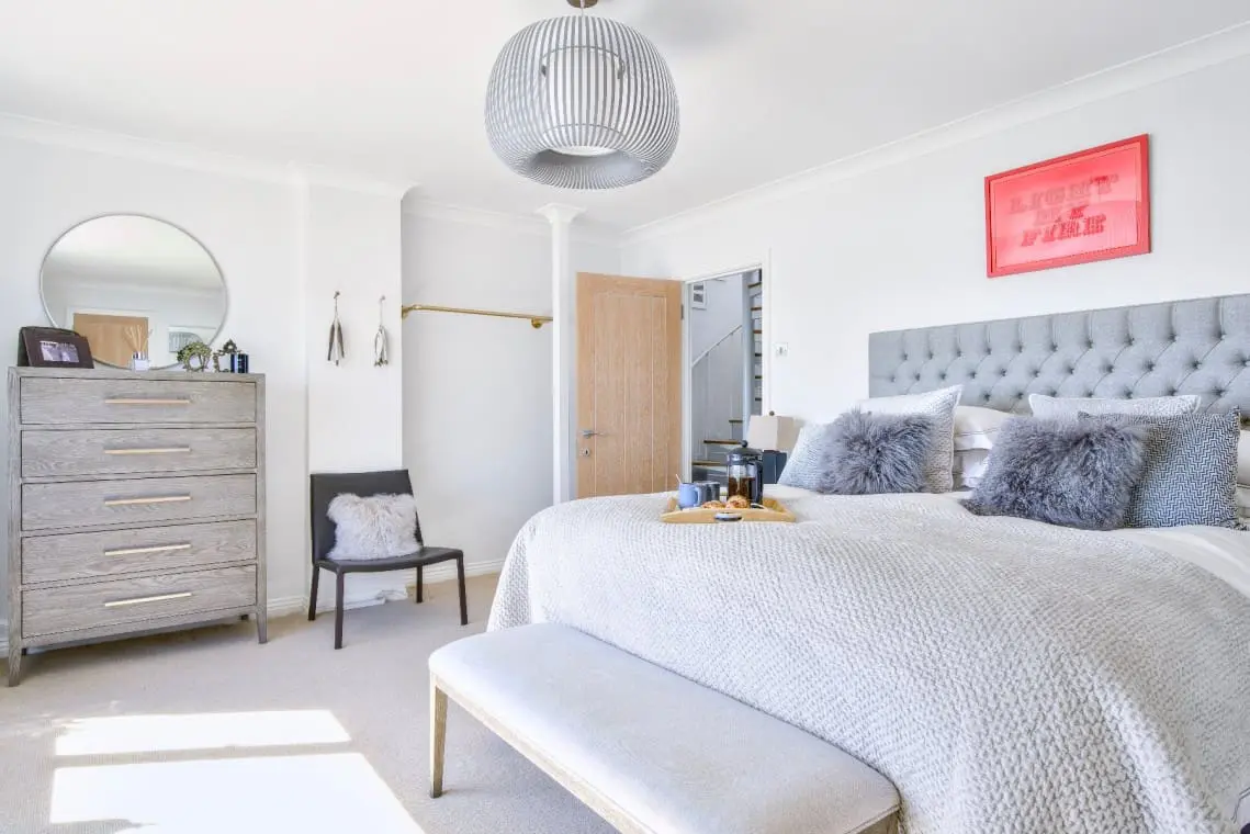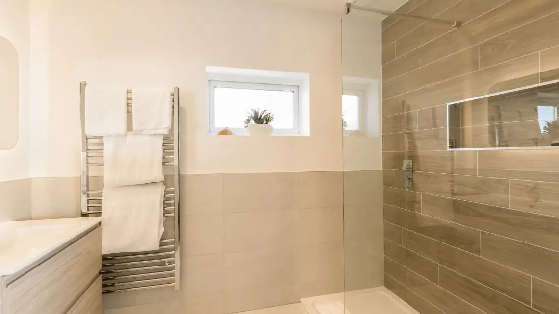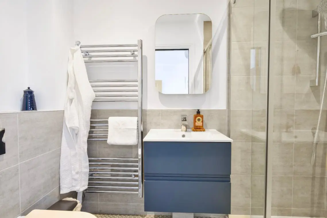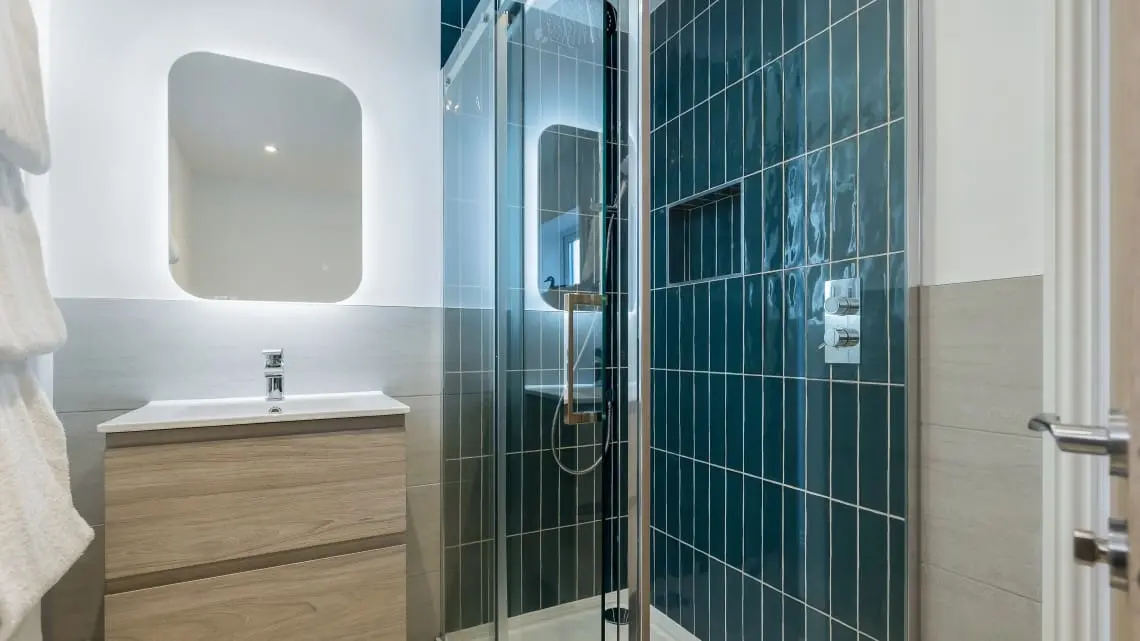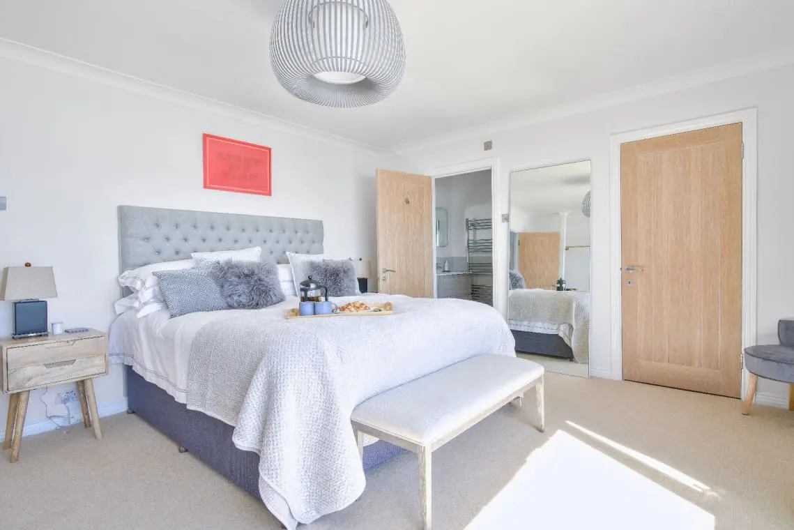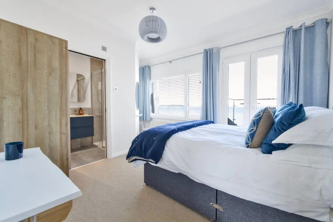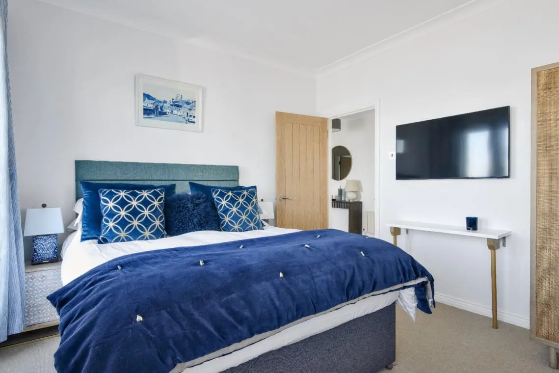 Harbour View Ensuite Bedroom – with king size bed, bedside tables, hairdryer and straightener, wardrobe and wall mounted TV. The ensuite has a large shower cubicle, basin, W/C and heated towel rail