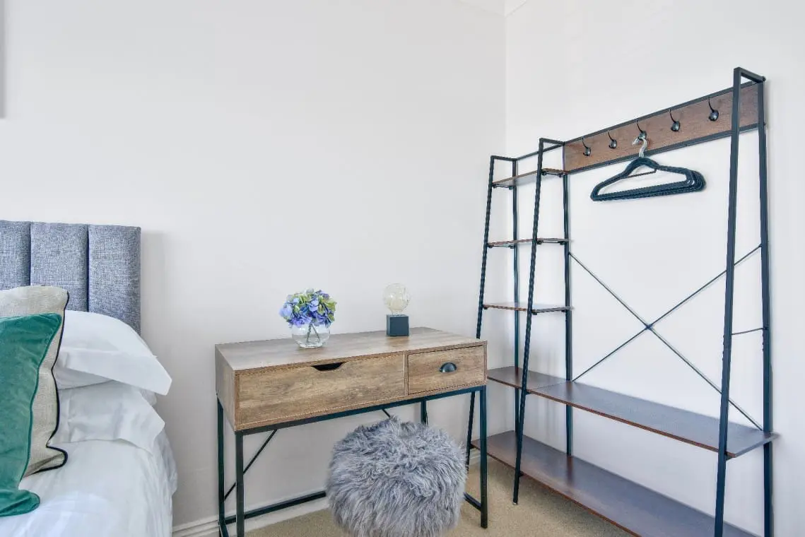 Twin Harbour View Bedroom – with twin beds (or king on request), bedside table, dressing table/desk with stool, hairdryer and straightener, hanging space for clothes and wall mounted TV