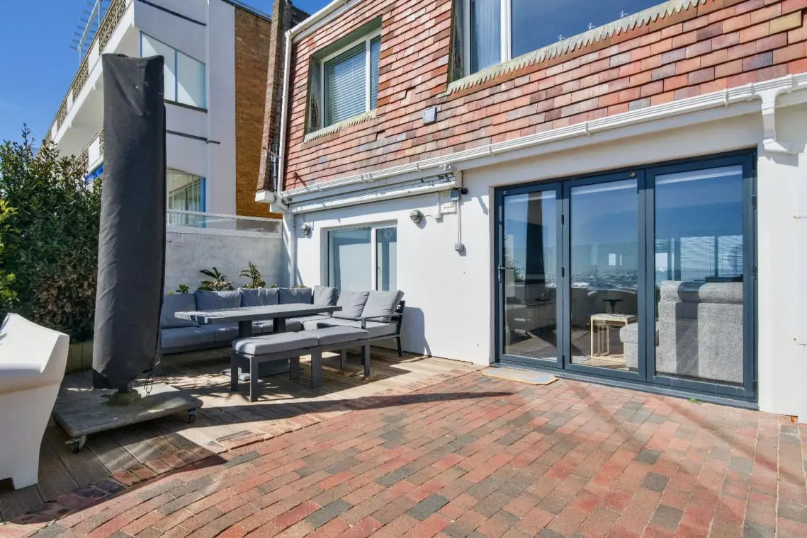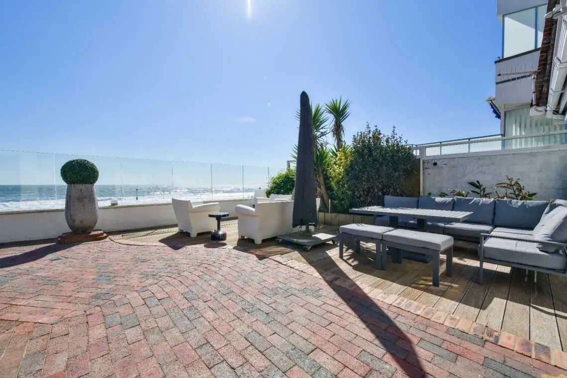 Second floor terraces with beach and harbour views, table and chairs, and sofa seating