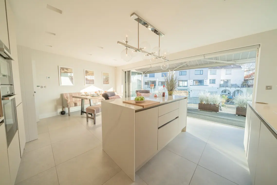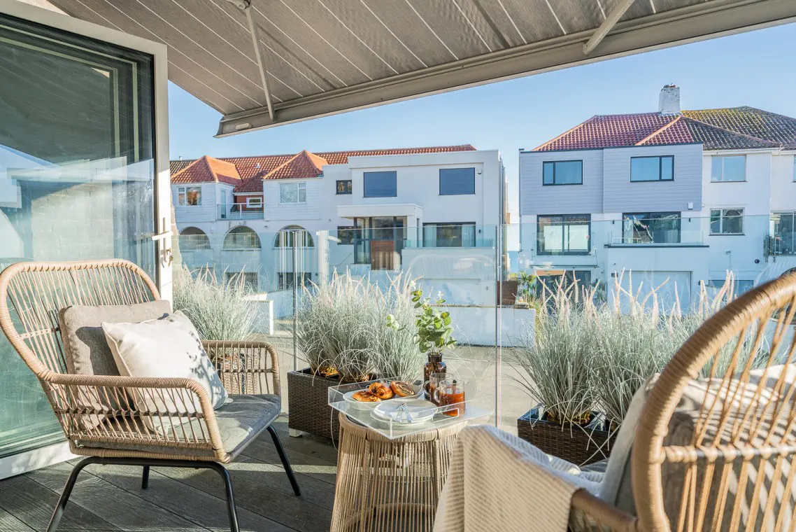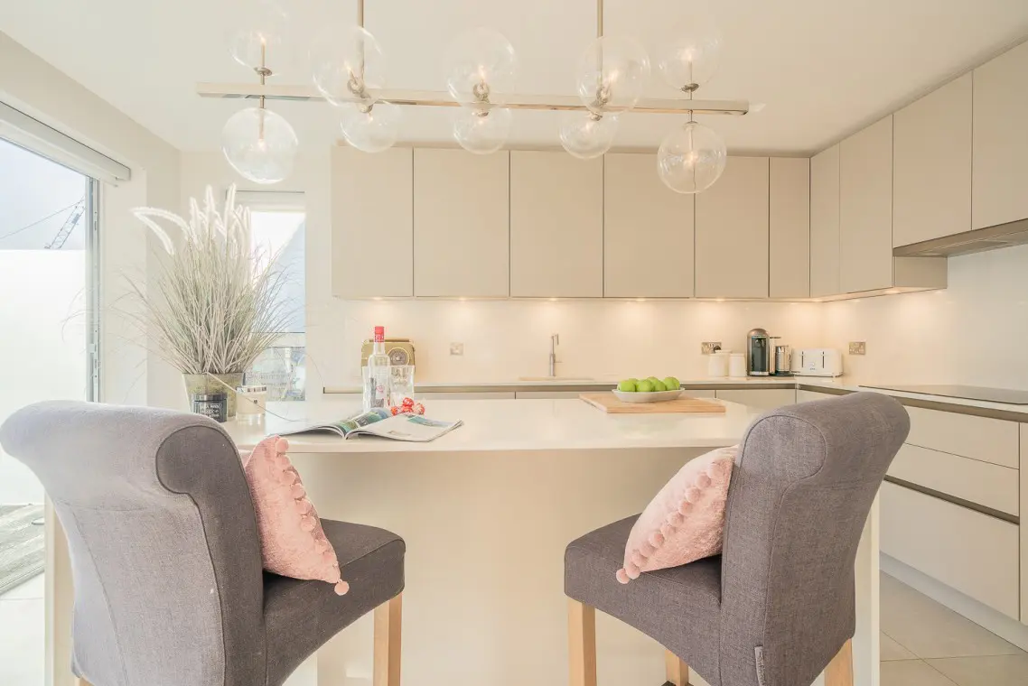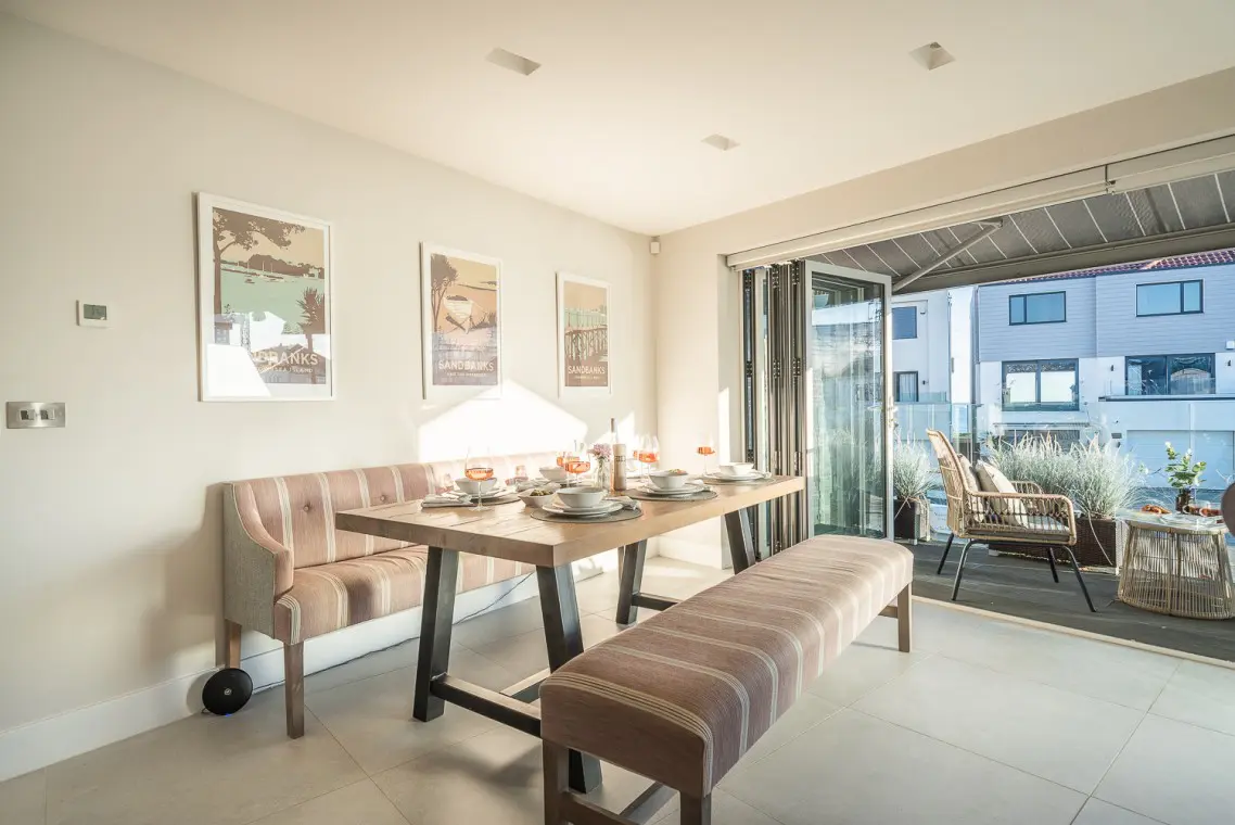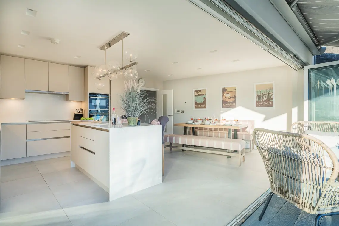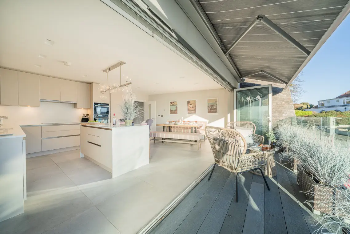 • First Floor: This is the social hub of the home. It boasts a beautifully fitted open-plan kitchen with a NEFF hob, two ovens, a Quooker tap, and an island breakfast bar. The large wooden dining table seats six, and bi-fold doors open onto a balcony with sea glimpses. The lounge offers a large, comfortable corner sofa, smart TV, and its own patio doors opening onto a second balcony overlooking the rear garden. A separate cloakroom is also on this level.
