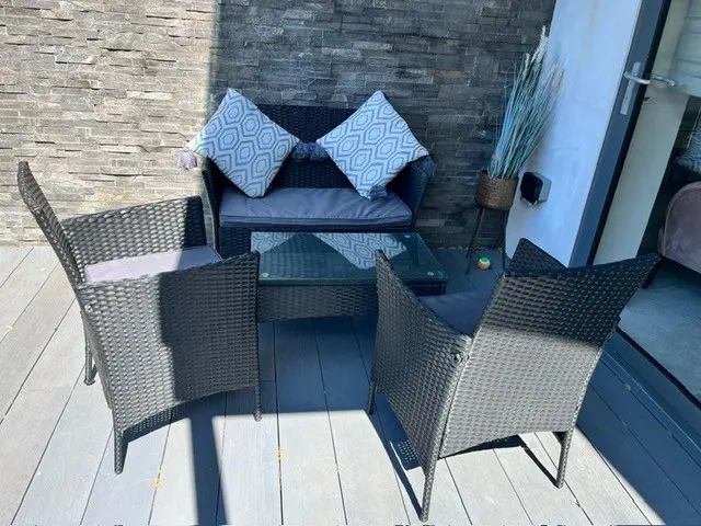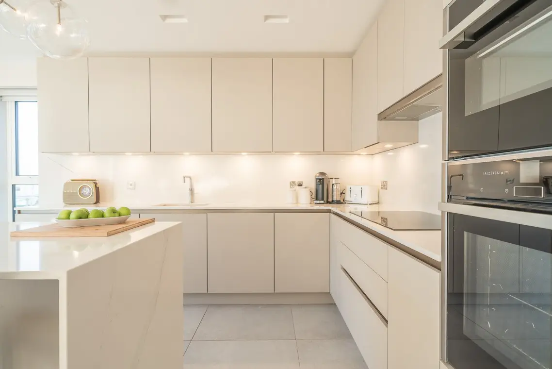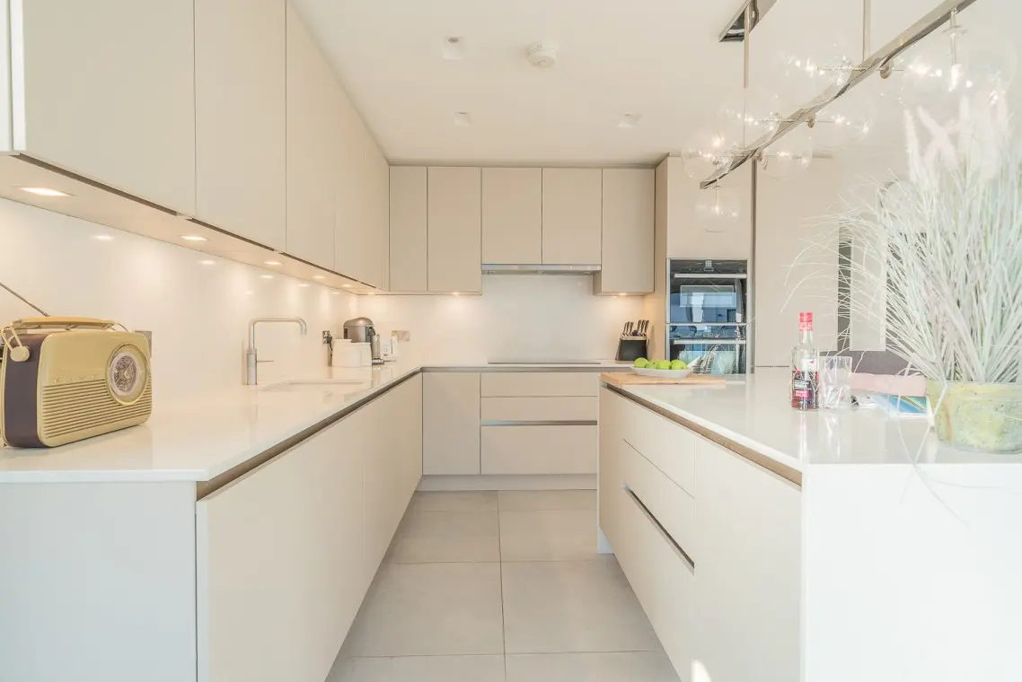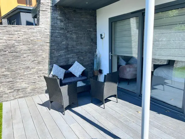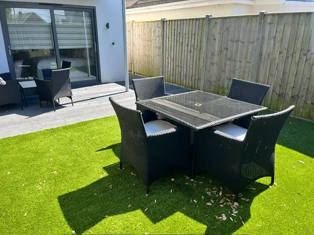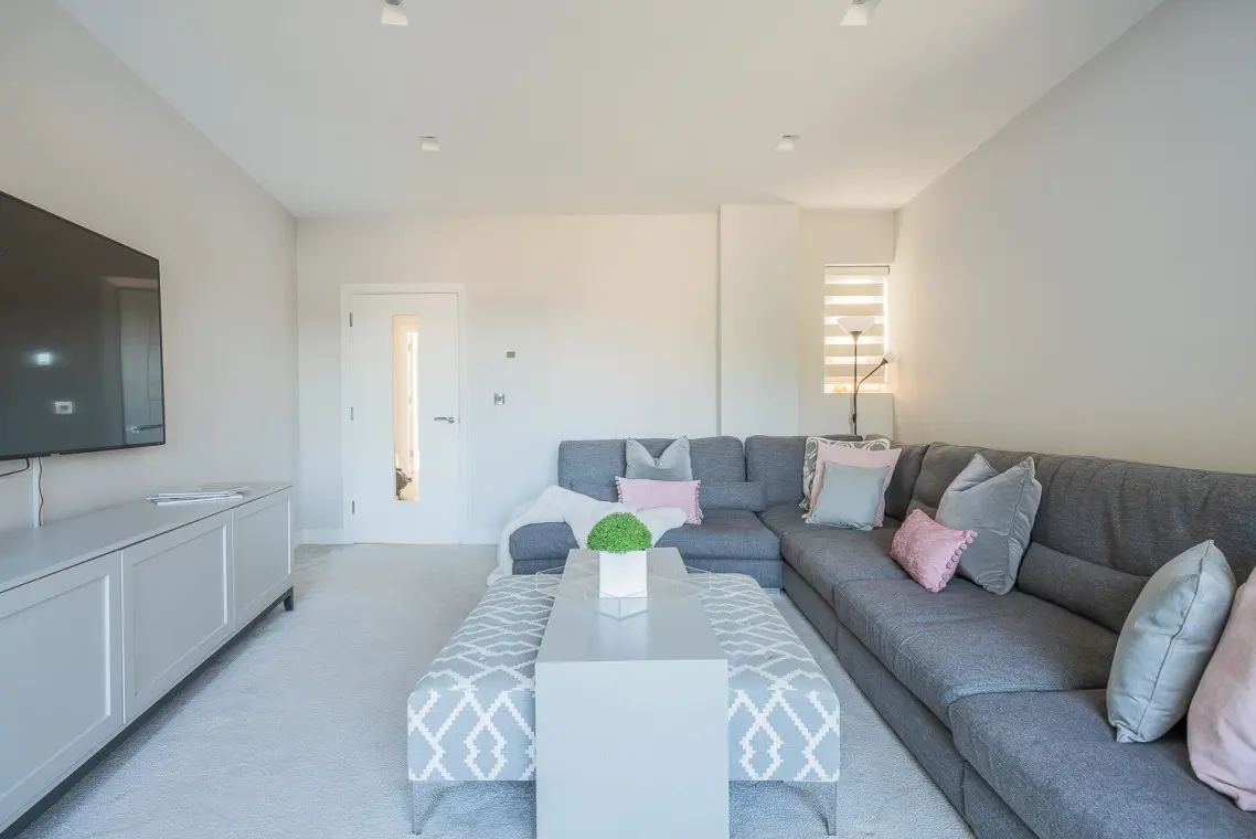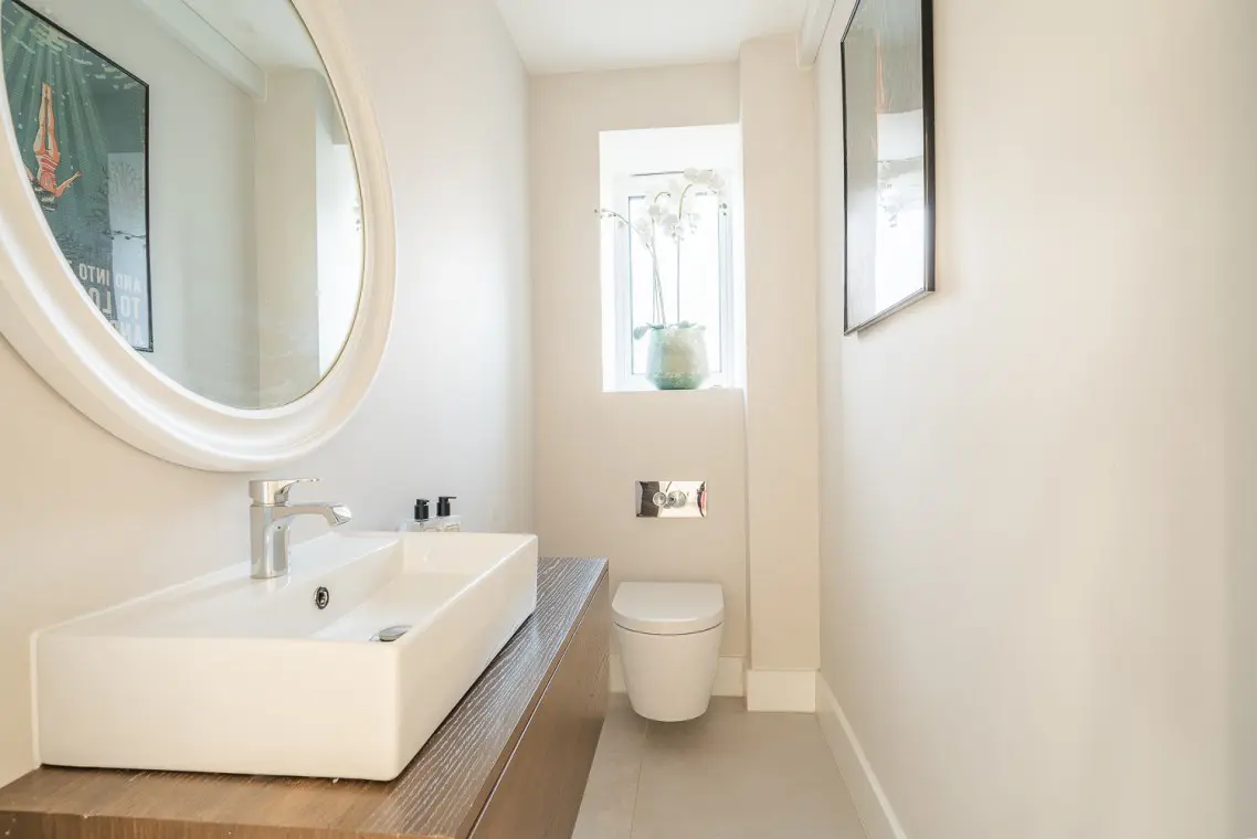 • First Floor: This is the social hub of the home. It boasts a beautifully fitted open-plan kitchen with a NEFF hob, two ovens, a Quooker tap, and an island breakfast bar. The large wooden dining table seats six, and bi-fold doors open onto a balcony with sea glimpses. The lounge offers a large, comfortable corner sofa, smart TV, and its own patio doors opening onto a second balcony overlooking the rear garden. A separate cloakroom is also on this level.