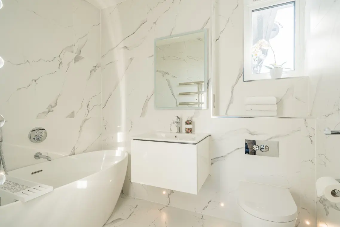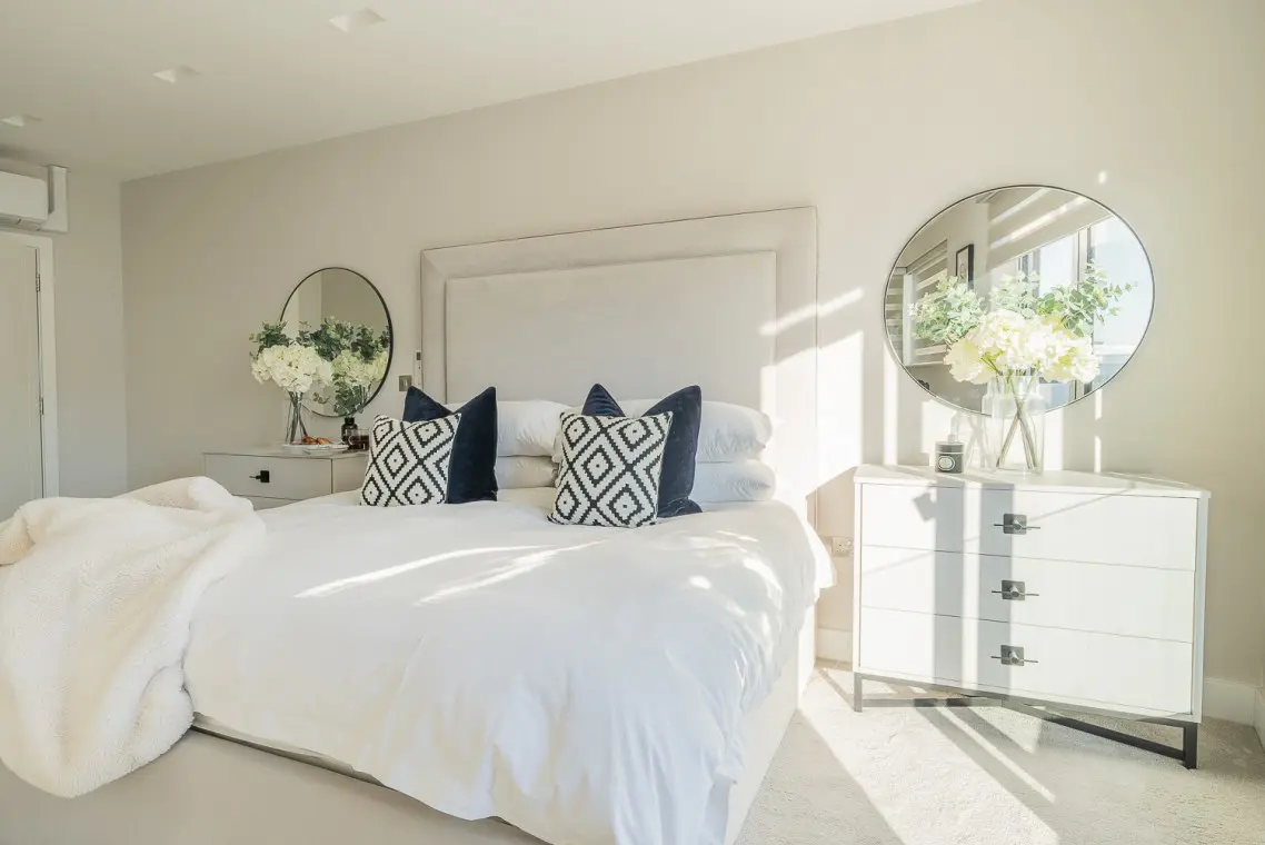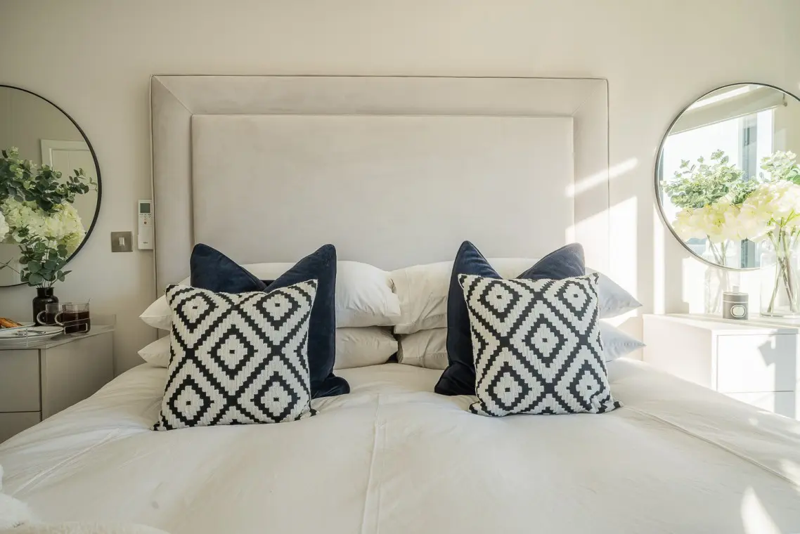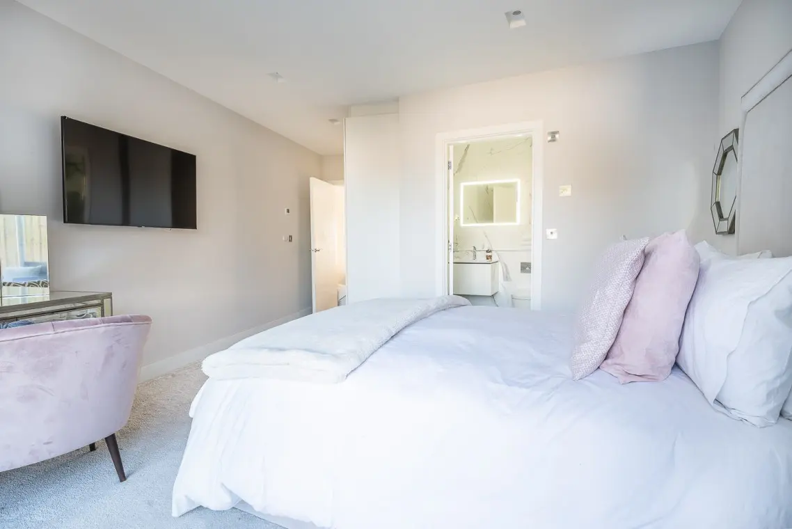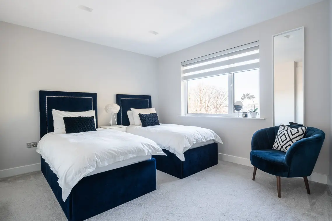 • Second Floor: The master super-king suite includes a separate dressing area (perfect for a quick work check-in) and a feature en-suite shower room with a skylight. The second bedroom features twin beds and an en-suite bathroom with a gorgeous freestanding bath.